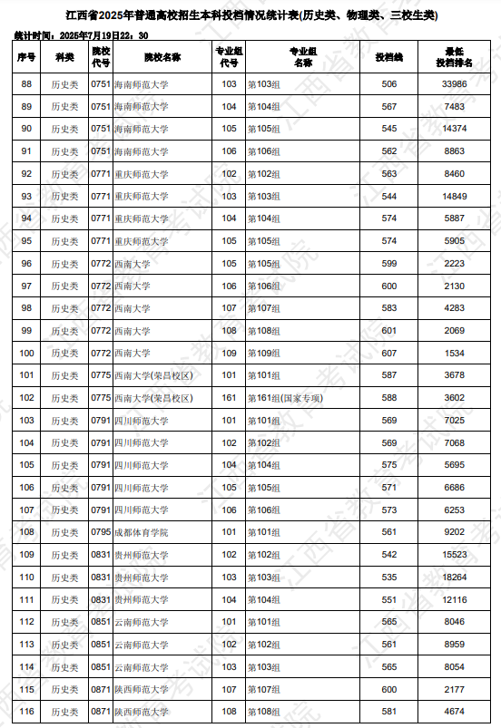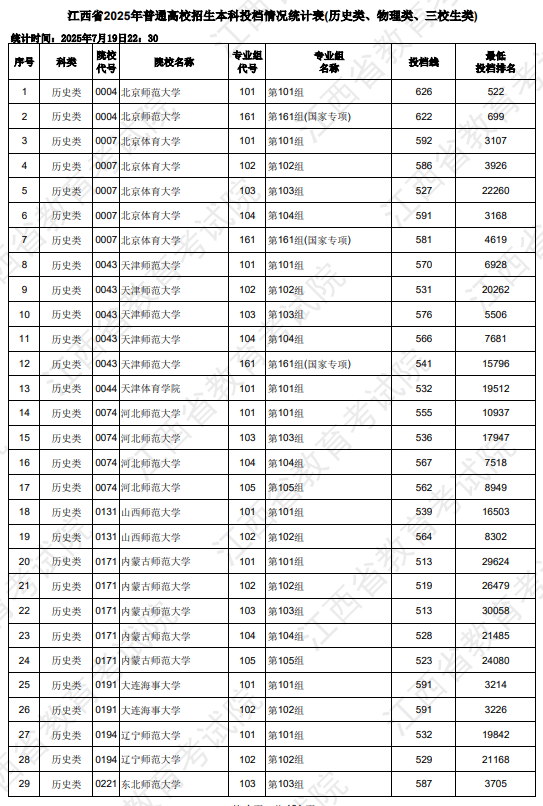 2025-07-22 17:26:39文/刘美娟今年江西历史类本科录取控制分数线为486分,而各高校的投档线则因学校和专业的不同而有所差异。以下是对2025年江西高考本科批院校录取投档最低分数线(历史类)的详细分析。