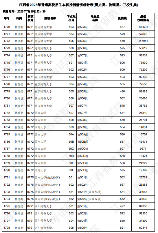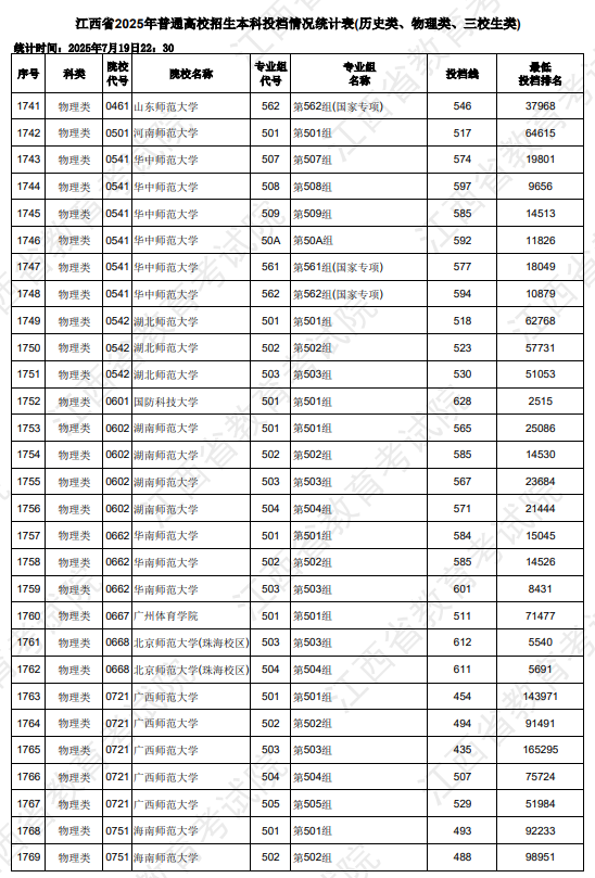 2025江西高考本科批院校录取投档最低分数线(物理类)