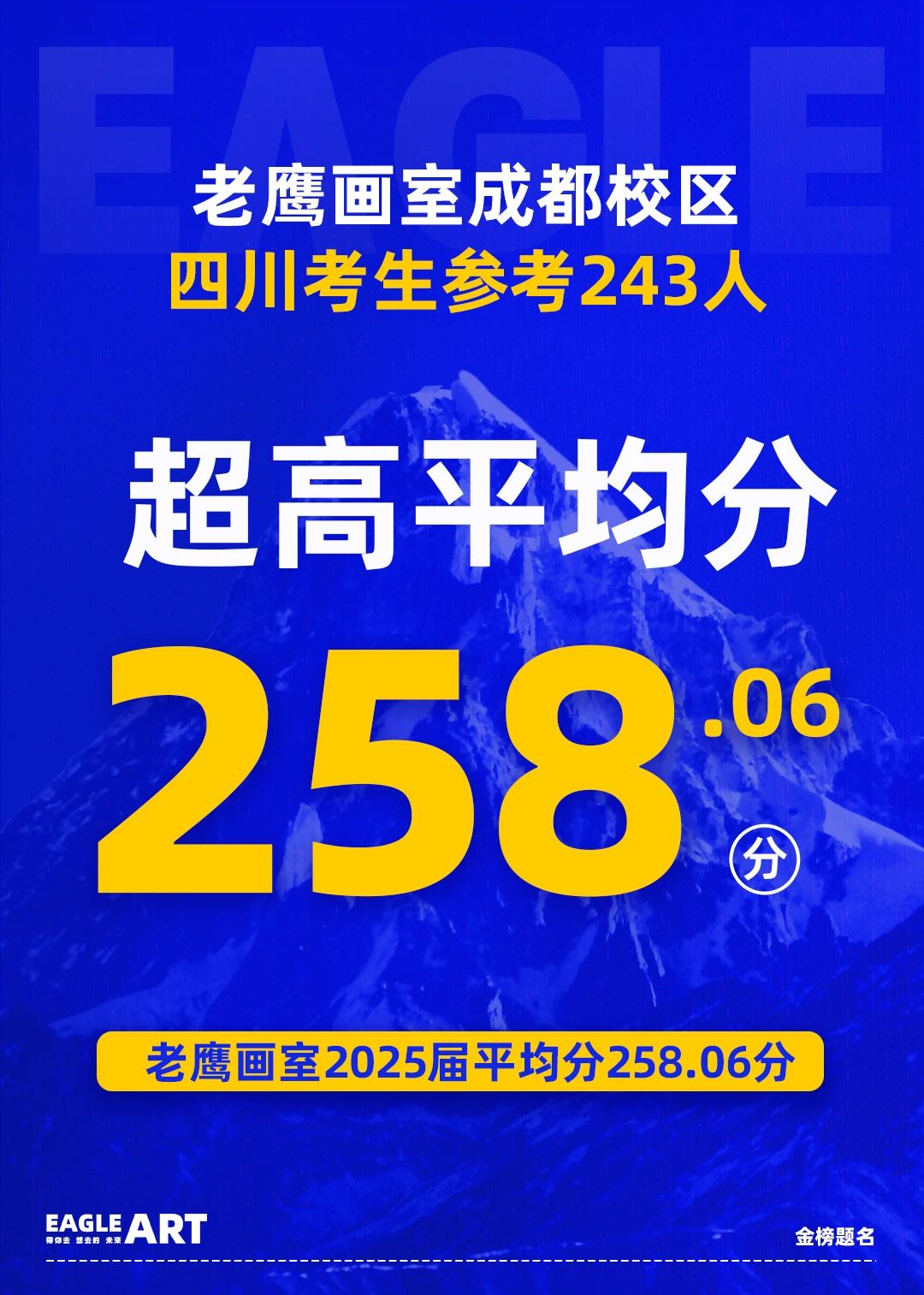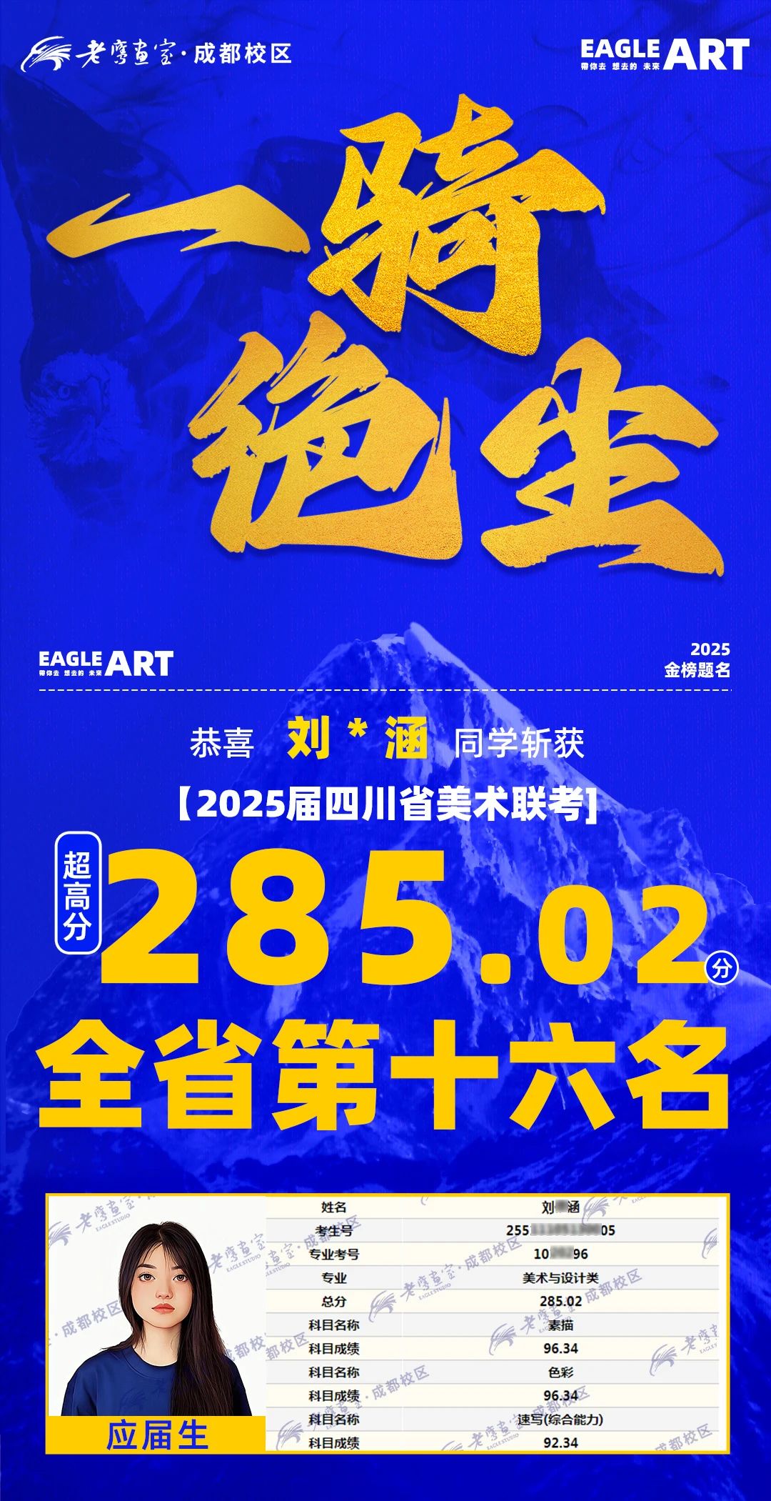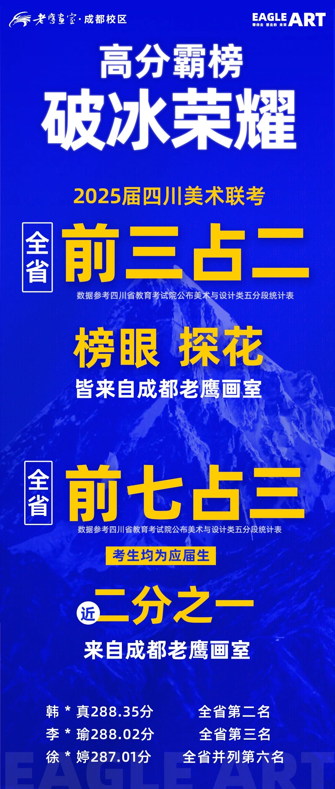 1.2025届四川省美术联考成都老鹰画室243人参考斩获全省第二榜眼,全省第三探花,全省并列第六。