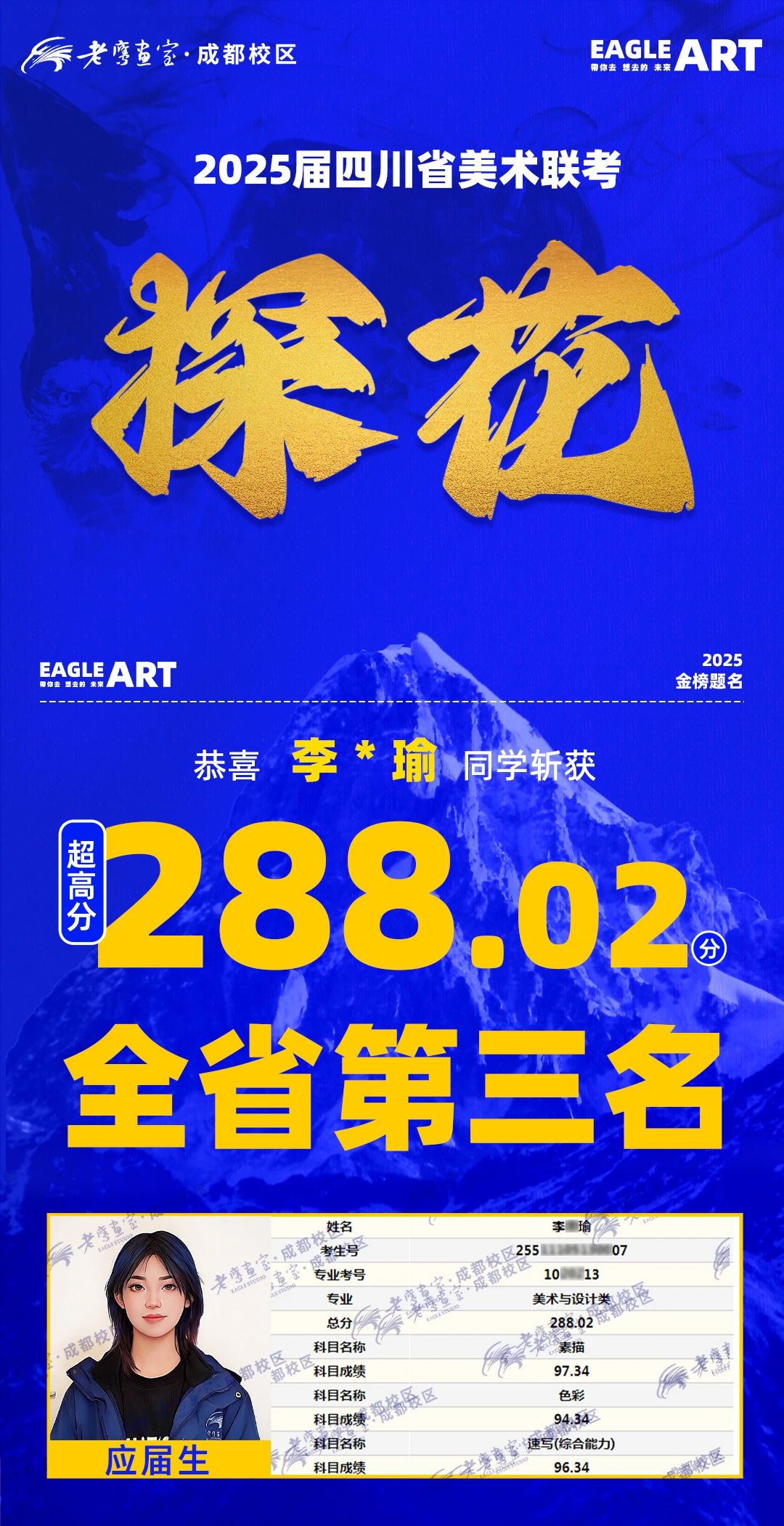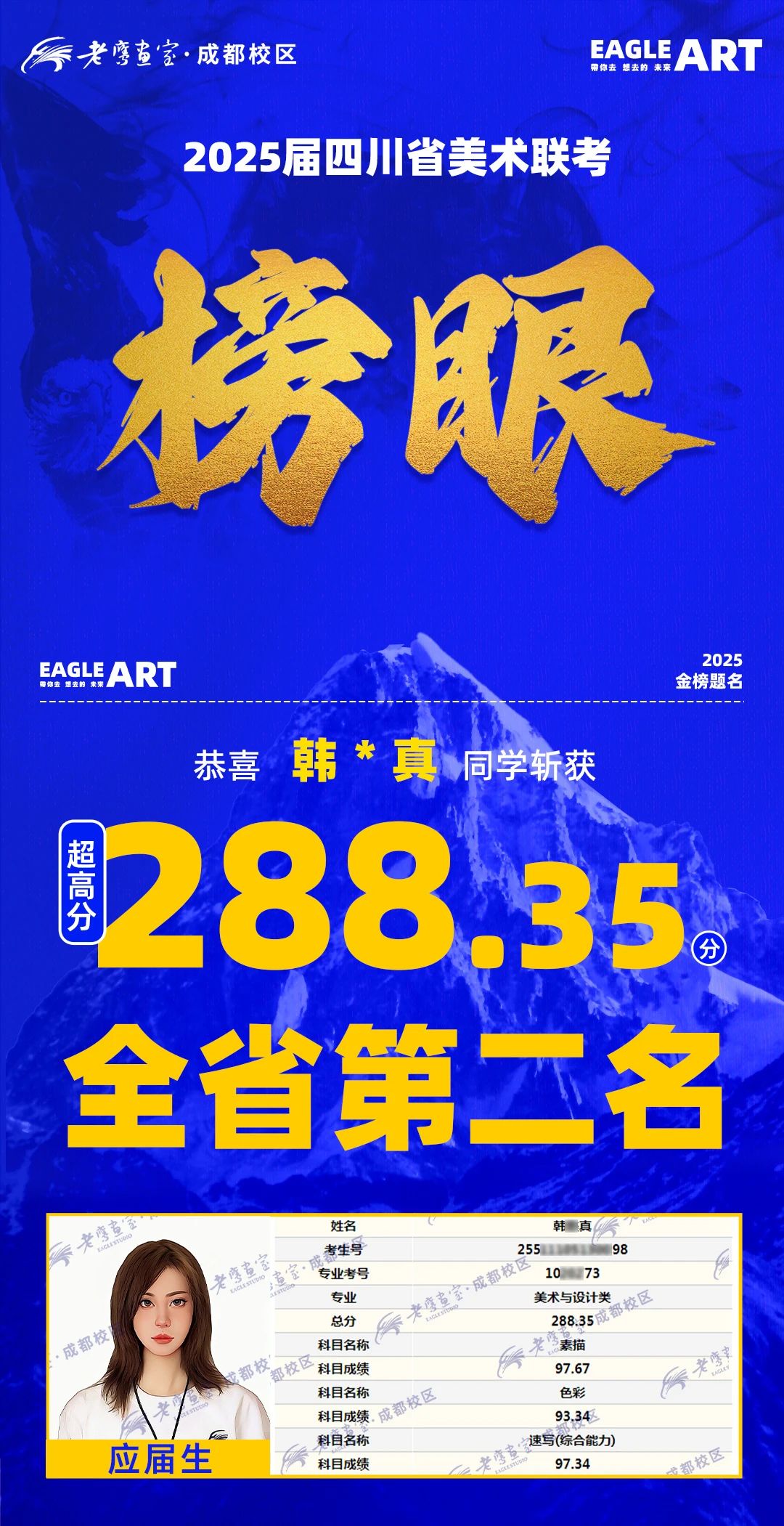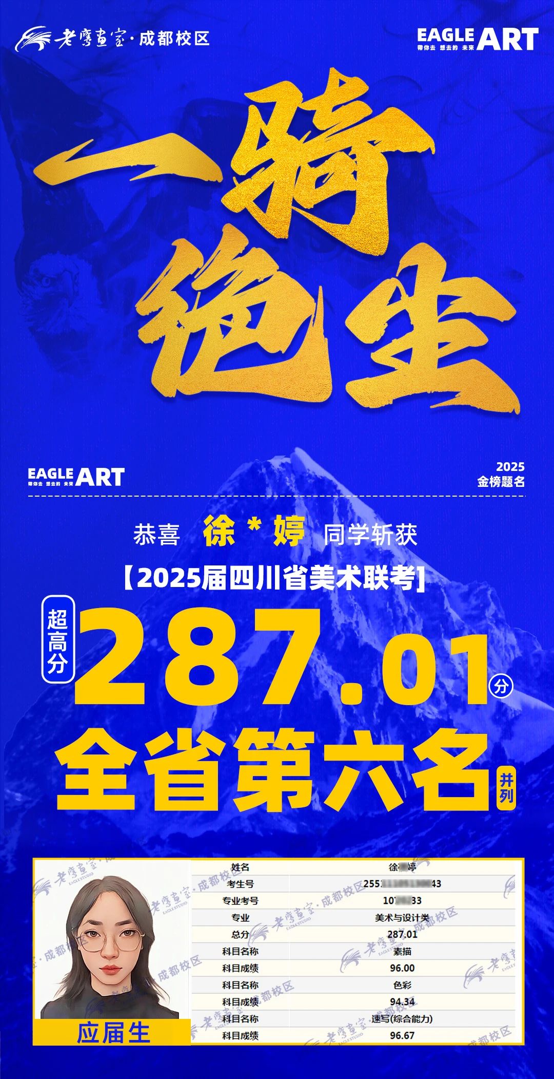 1.2025届四川省美术联考成都老鹰画室243人参考斩获全省第二榜眼,全省第三探花,全省并列第六。