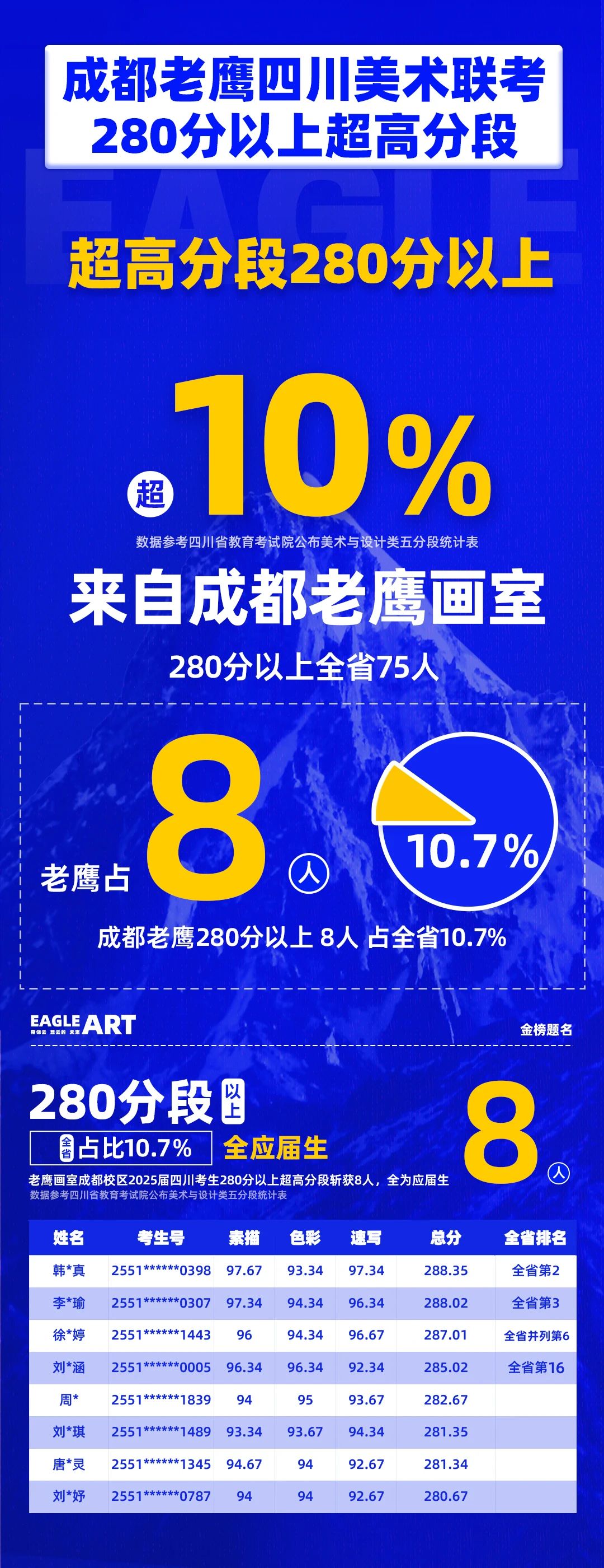 280分段,优势显著:全省280分以上的高分阵营中,老鹰画室成都校区学子以8人的佳绩,占比超过百分之十