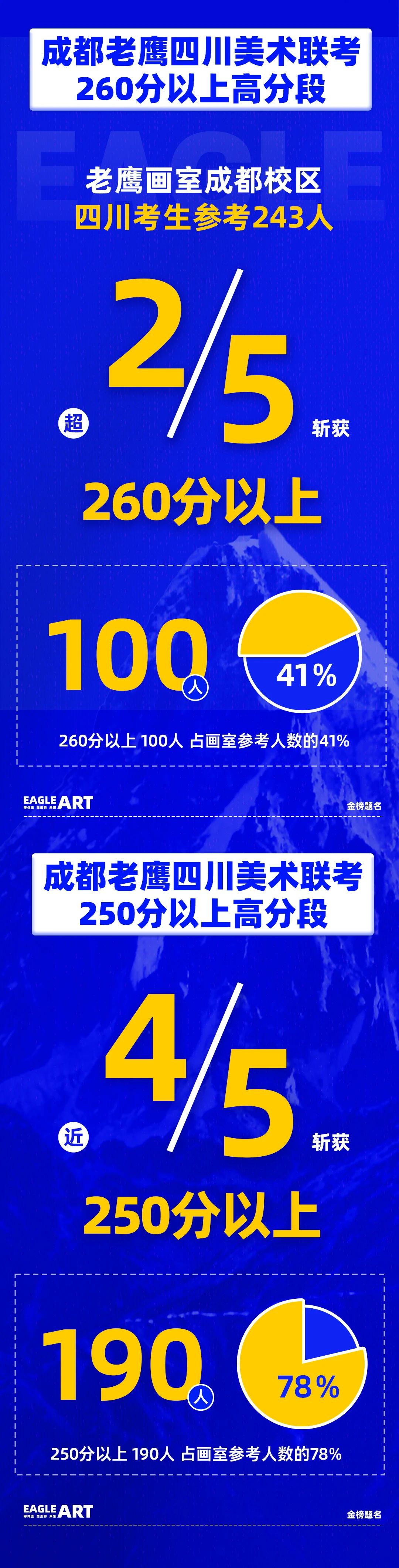 超高分段,独占风骚:在全省285分以上的超高分段中,共有17位佼佼者,老鹰画室成都校区占据了其中的4席,且均为应届生,占比近四分之一。