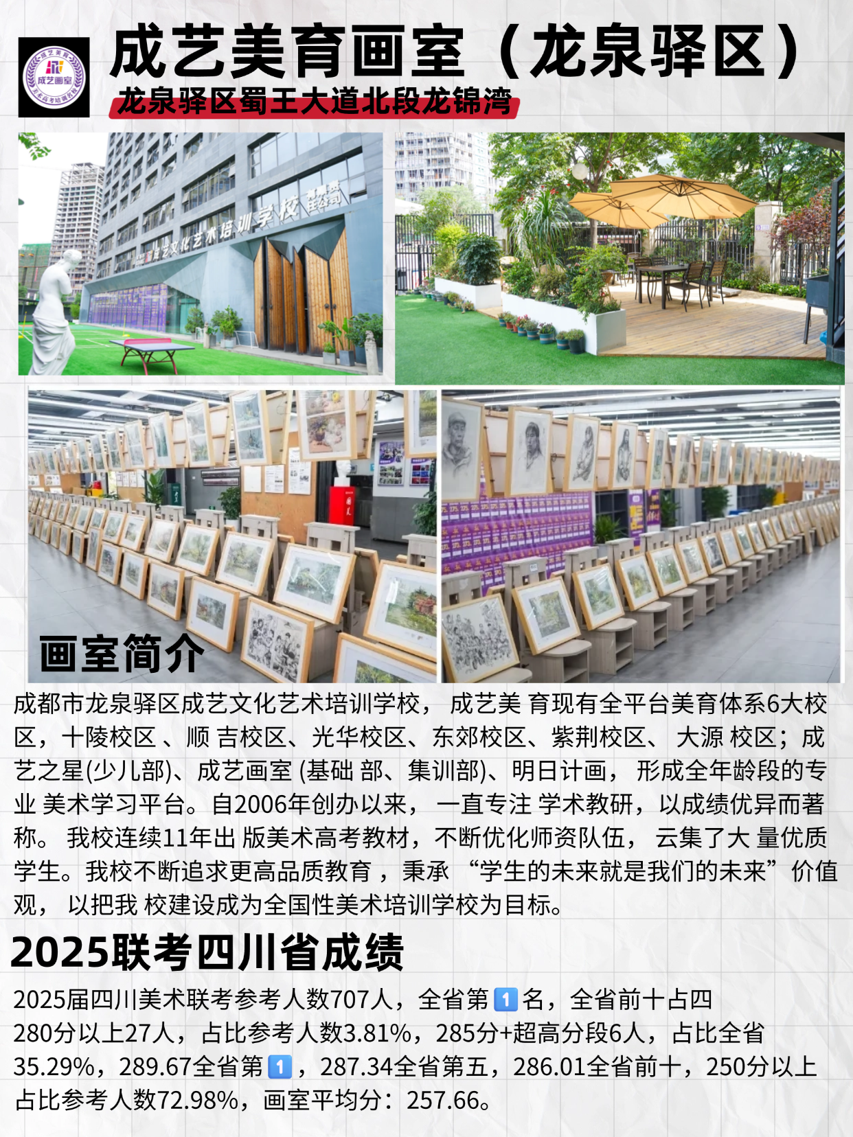 画室介绍:成都市龙泉驿区成艺文化艺术培训学校, 成艺美 育现有全平台美育体系6大校区,十陵校区 、顺 吉校区、光华校区、东郊校区、紫荆校区、 大源 校区;成艺之星(少儿部)、成艺画室 (基础 部、集训部)、明日计画, 形成全年龄段的专业 美术学习平台。自2006年创办以来, 一直专注 学术教研,以成绩优异而著称。 我校连续11年出 版美术高考教材,不断优化师资队伍, 云集了大 量优质学生。我校不断追求更高品质教育 ,秉承 “学生的未来就是我们的未来”价值观, 以把我 校建设成为全国性美术培训学校为目标。
