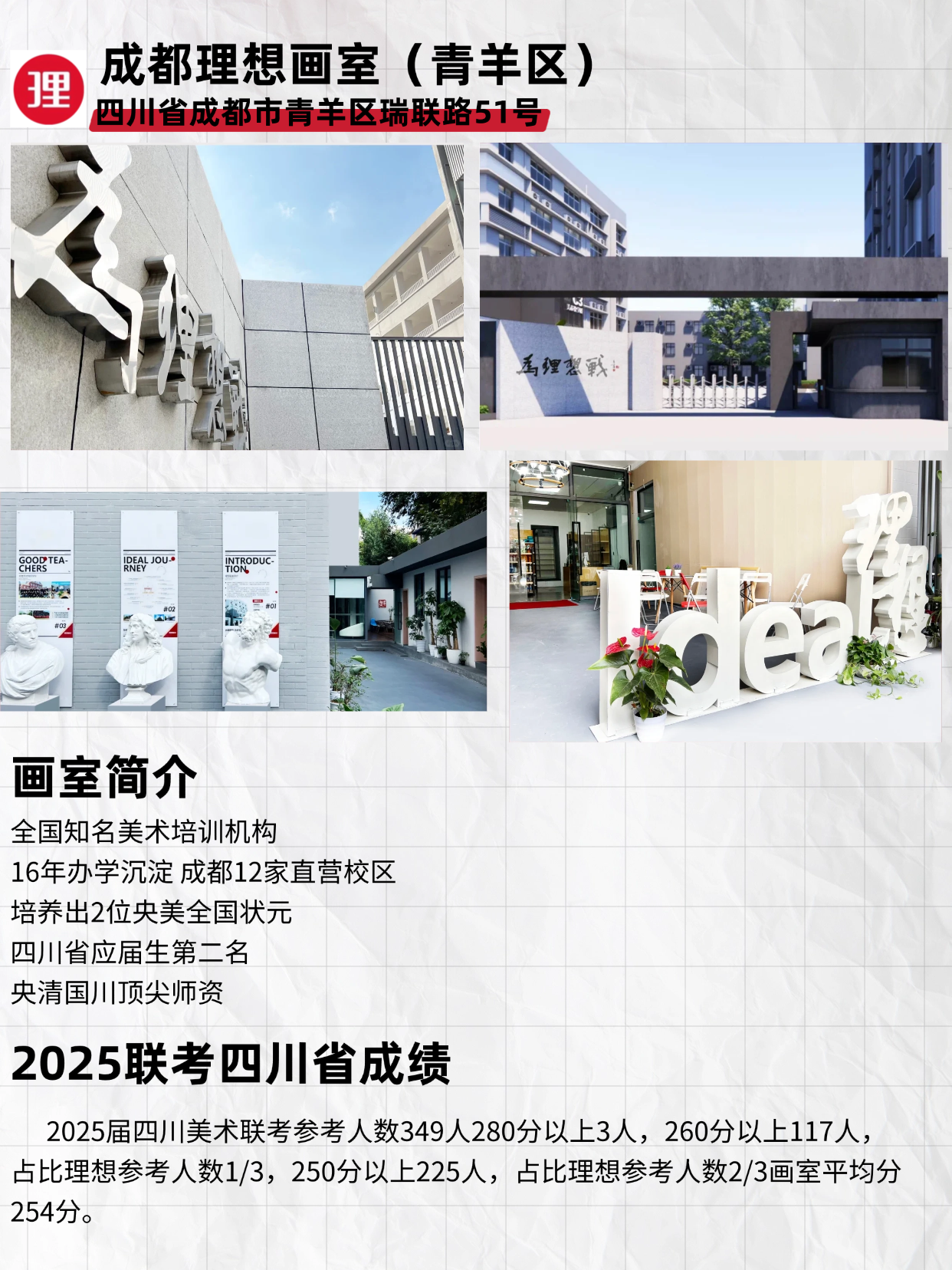 · 核心优势:成都本土老牌画室(2009 年创办),9 大校区覆盖全城,一站式美术集训服务,专注应试技巧与高效备考
