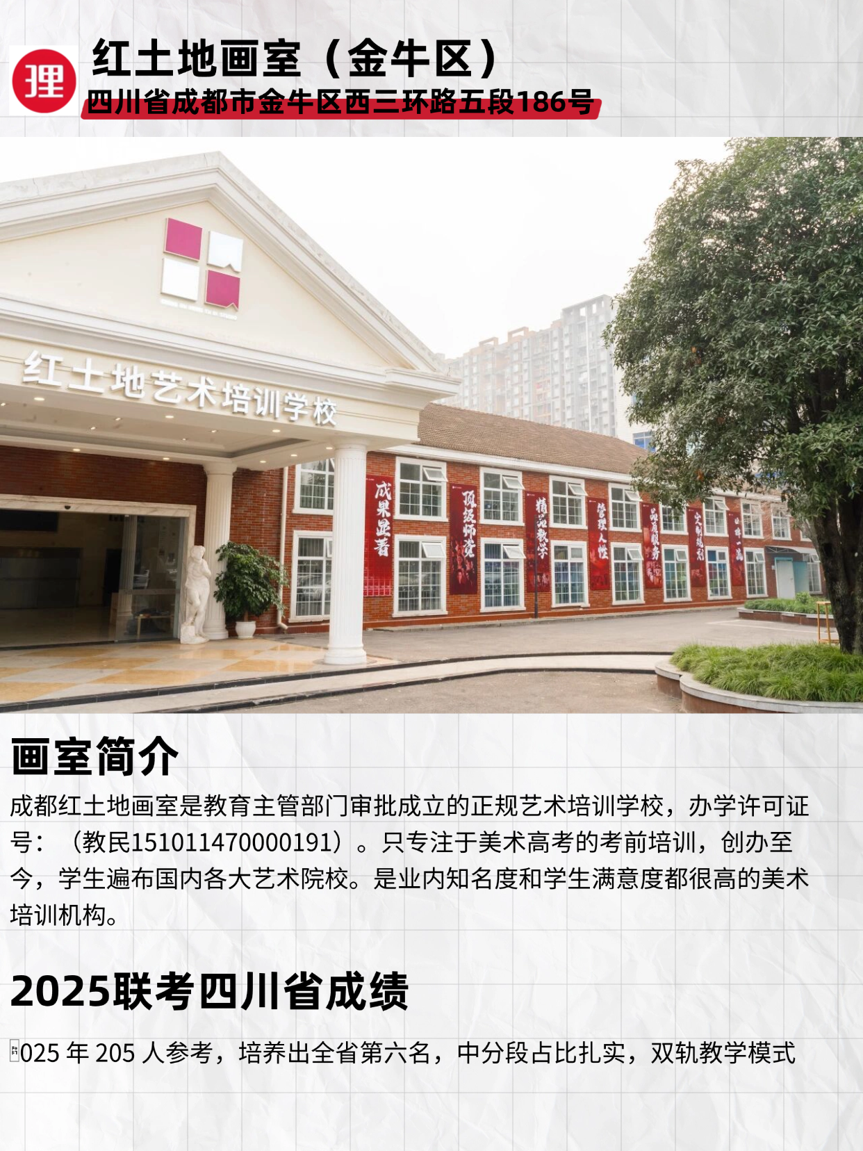 成都红土地画室是教育主管部门审批成立的正规艺术培训学校,办学许可证号:(教民151011470000191)。只专注于美术高考的考前培训,创办至今,学生遍布国内各大艺术院校。是业内知名度和学生满意度都很高的美术培训机构。