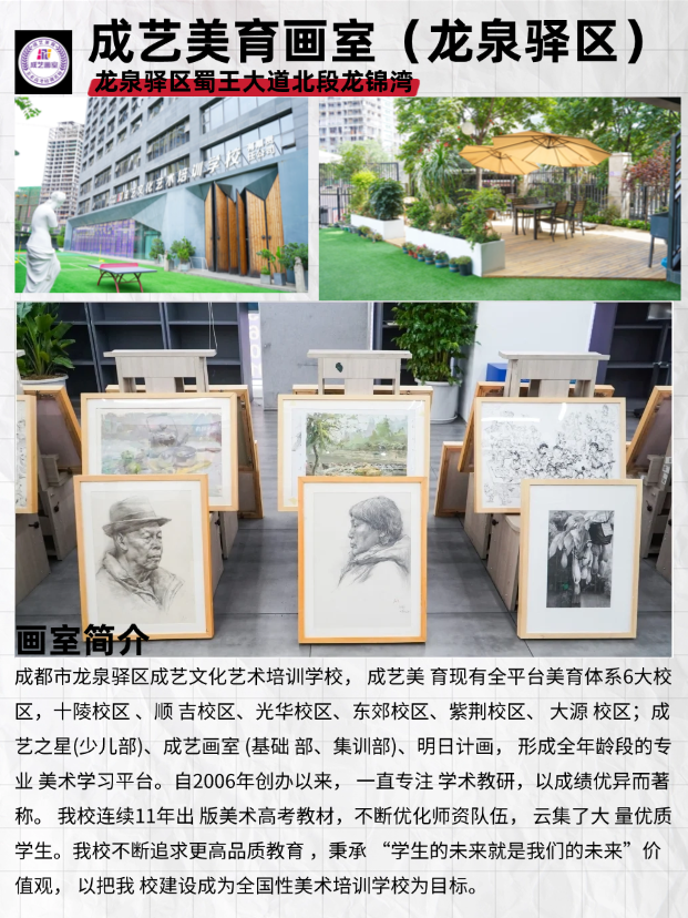 画室介绍:成都市龙泉驿区成艺文化艺术培训学校, 成艺美 育现有全平台美育体系6大校区,十陵校区 、顺 吉校区、光华校区、东郊校区、紫荆校区、 大源 校区;成艺之星(少儿部)、成艺画室 (基础 部、集训部)、明日计画, 形成全年龄段的专业 美术学习平台。自2006年创办以来, 一直专注 学术教研,以成绩优异而著称。 我校连续11年出 版美术高考教材,不断优化师资队伍, 云集了大 量优质学生。我校不断追求更高品质教育 ,秉承 “学生的未来就是我们的未来”价值观, 以把我 校建设成为全国性美术培训学校为目标。