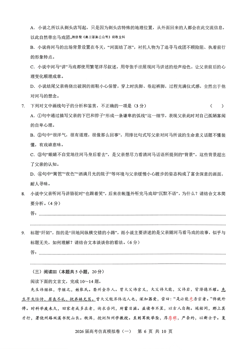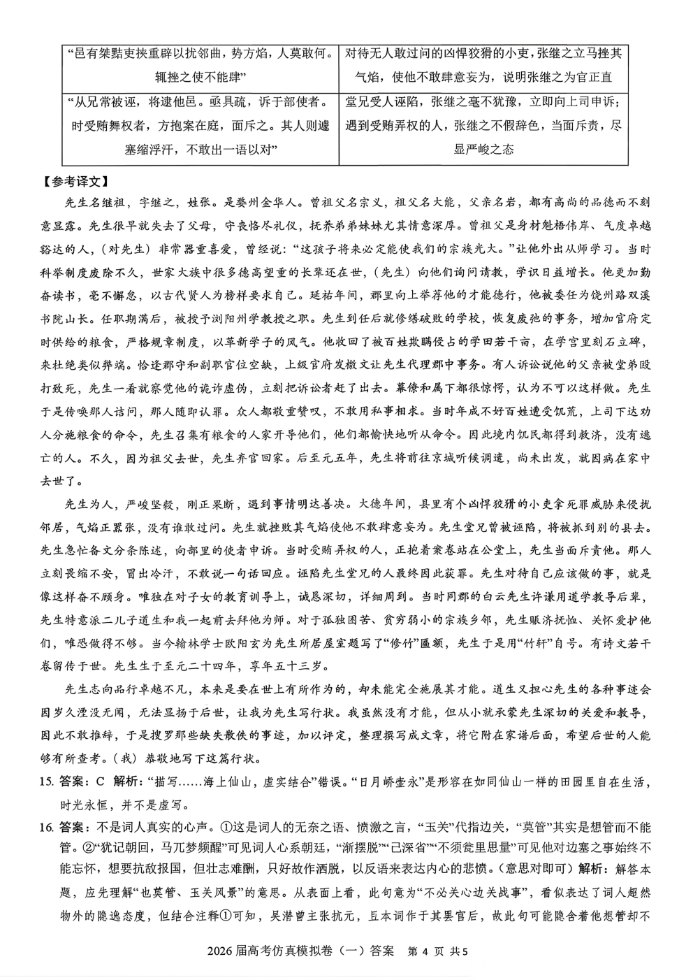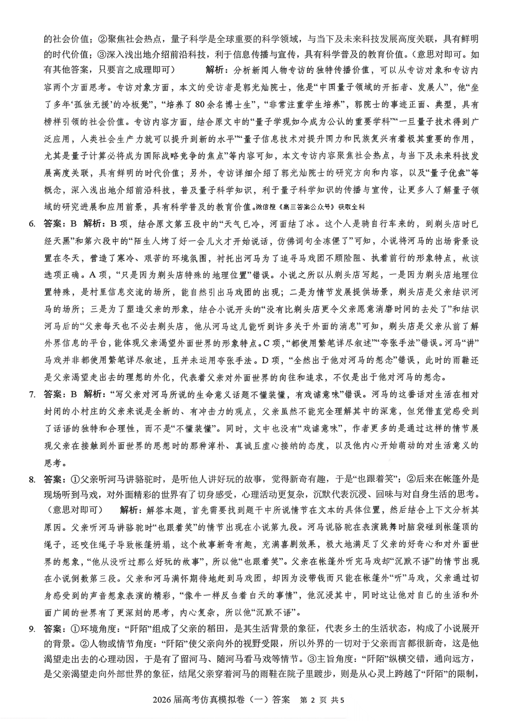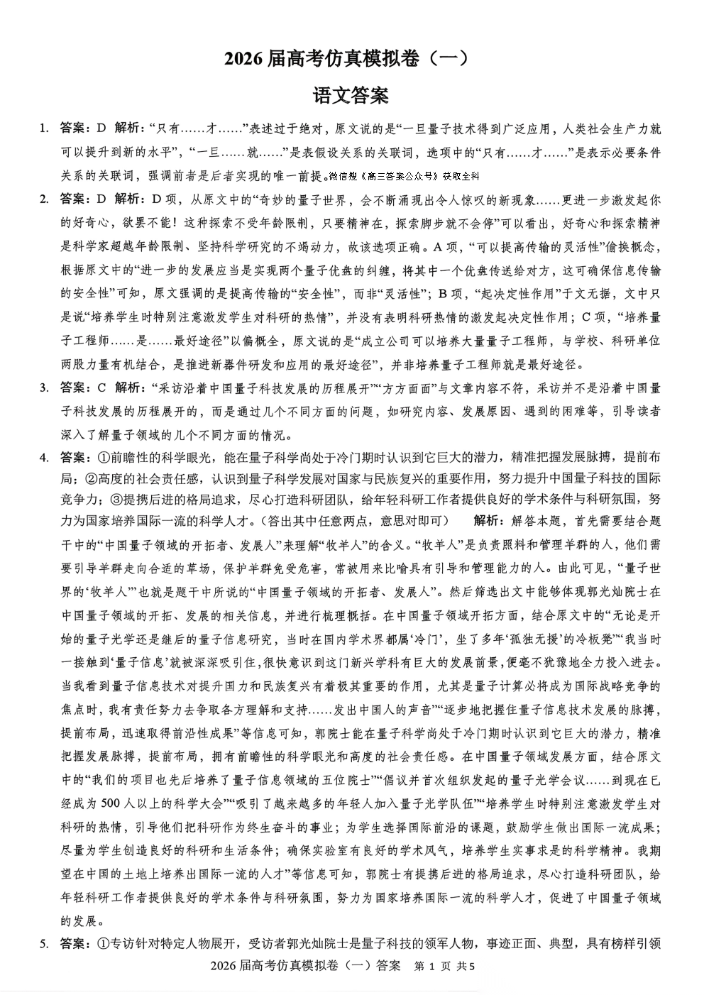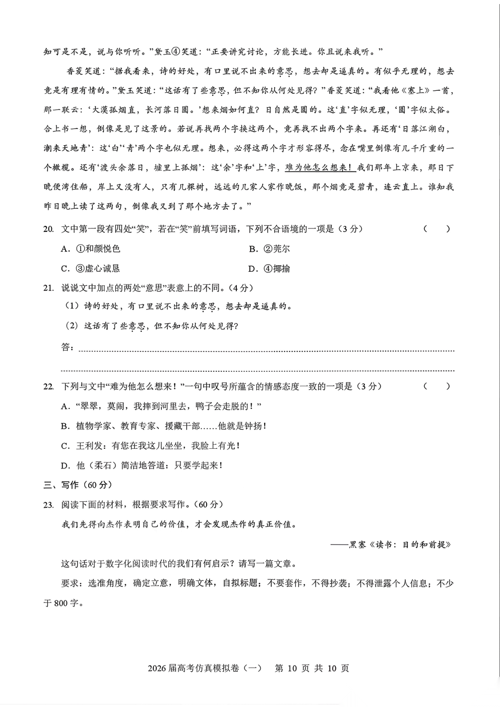 2026届高考仿真模拟卷一答案