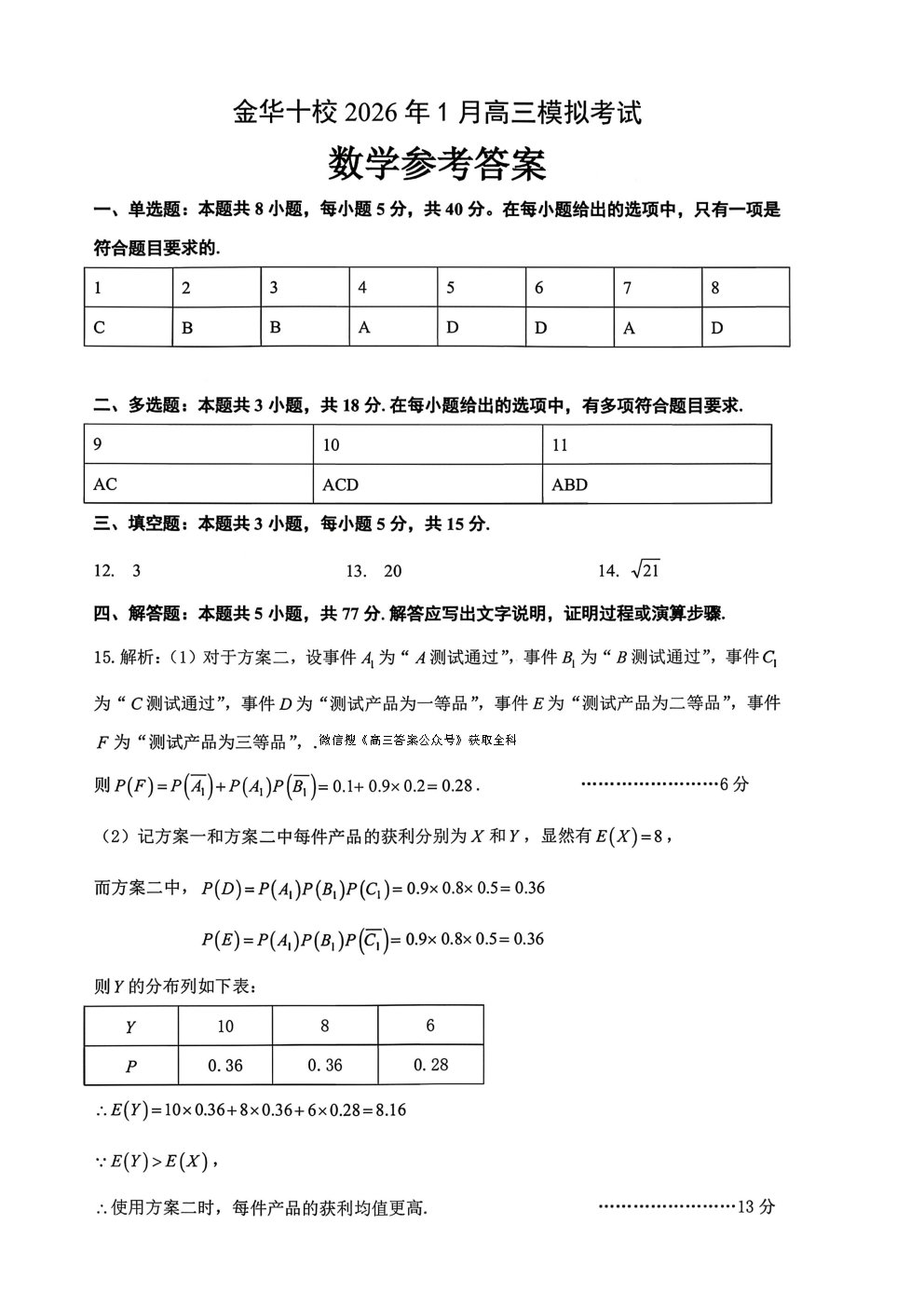 金华十校2025-2026学年高三期末调研考试答案