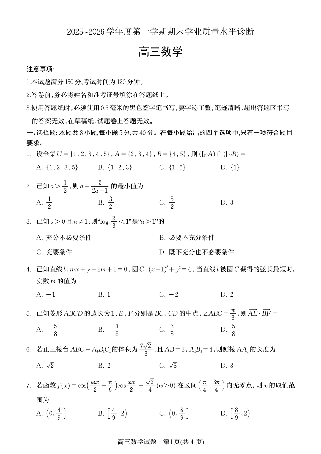 山东省烟台市2026届高三第一学期1月期末学业质量水平诊断