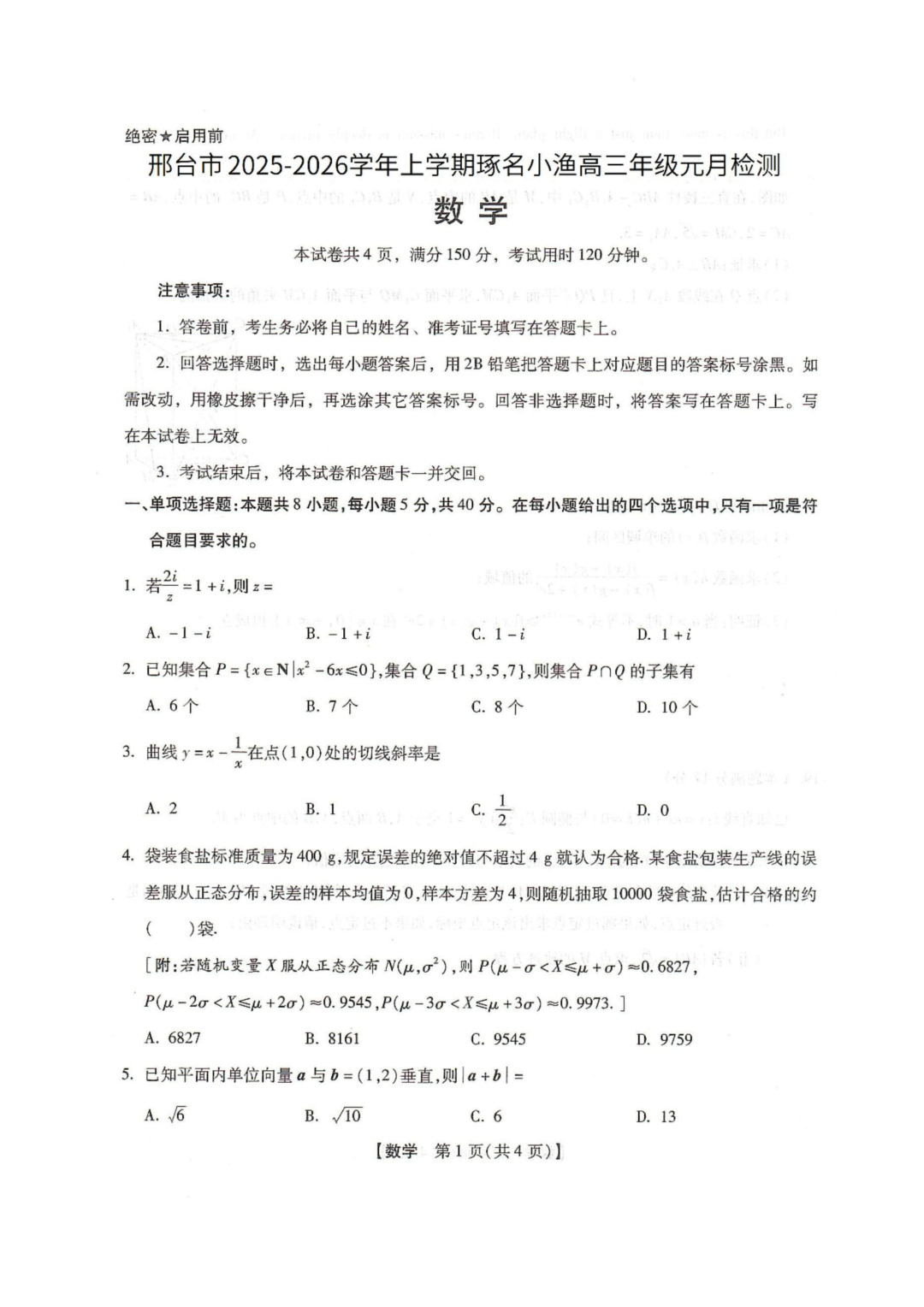 河北省邢台市琢名小渔2026届高三上学期1月月考