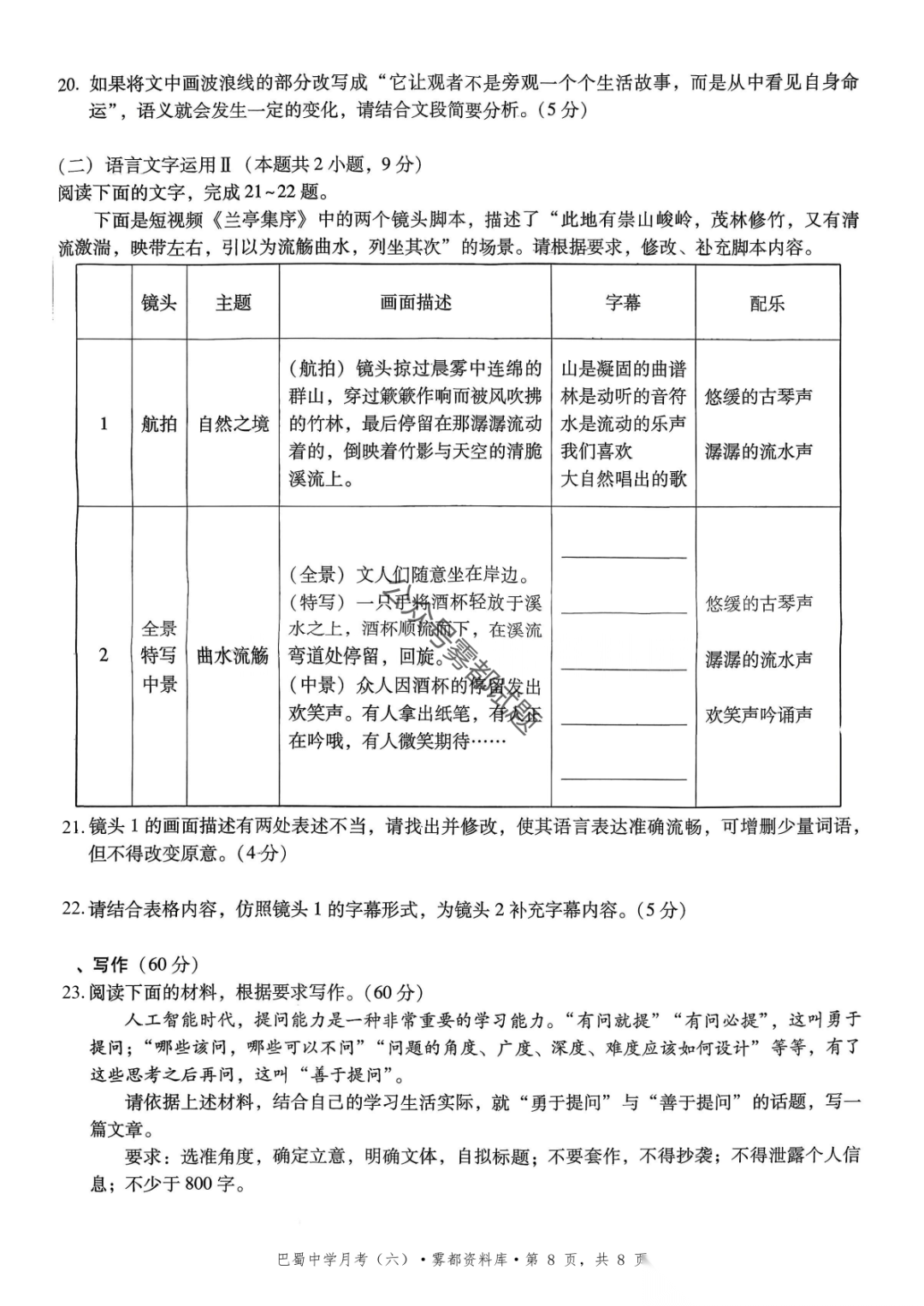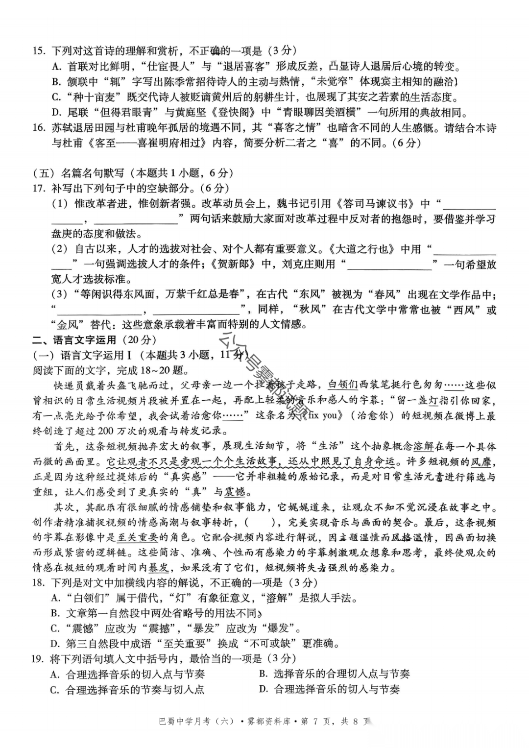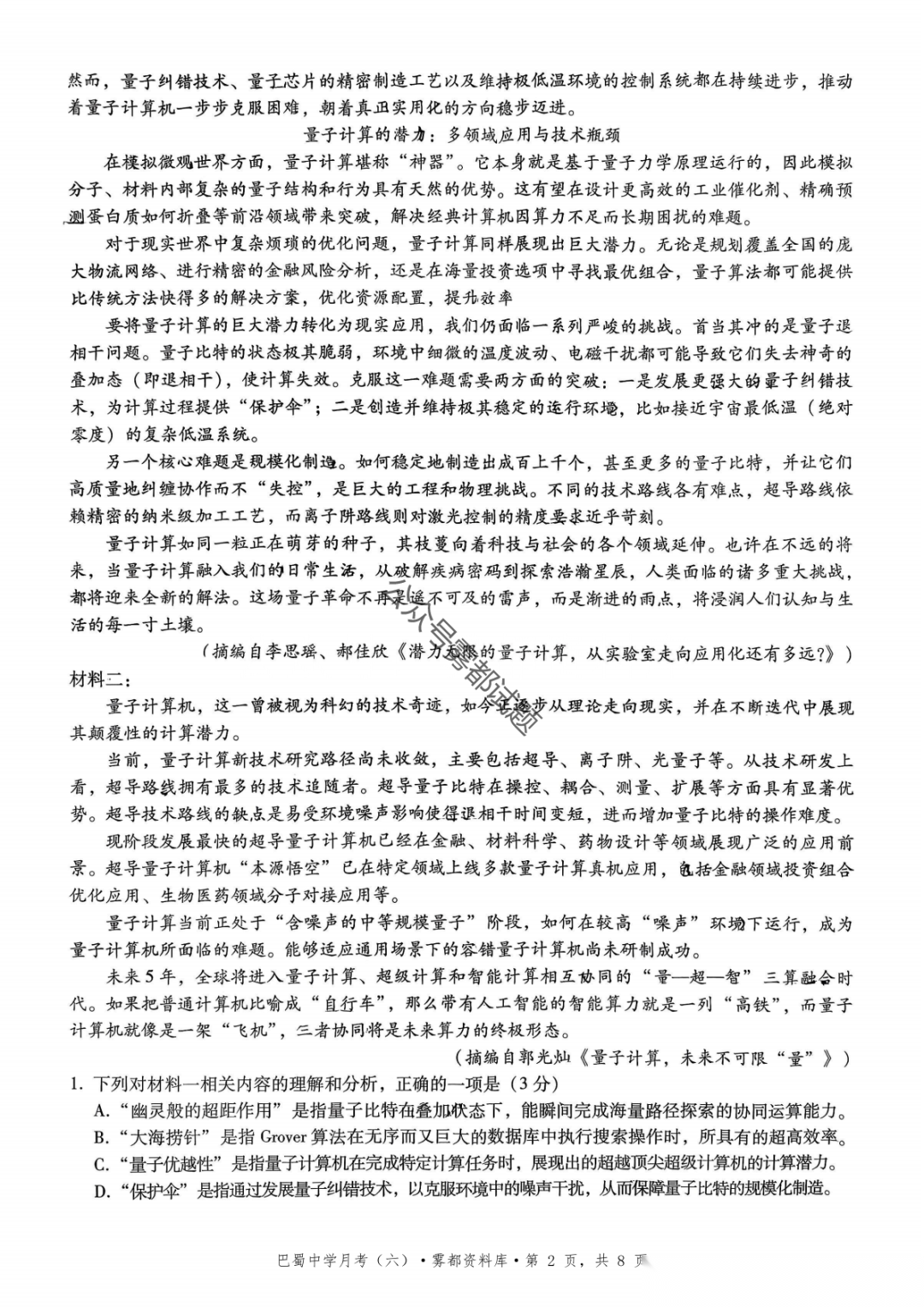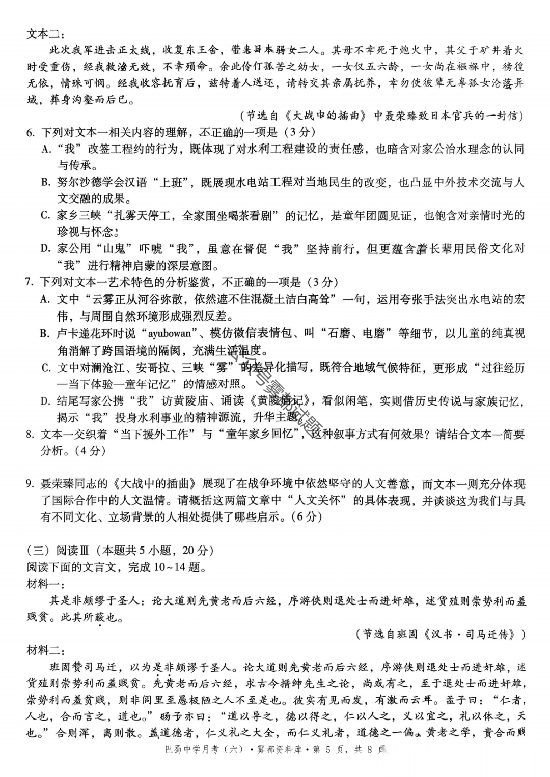 2026届重庆市巴蜀中学高三1月月考卷(五)语文、数学试卷及参考答案