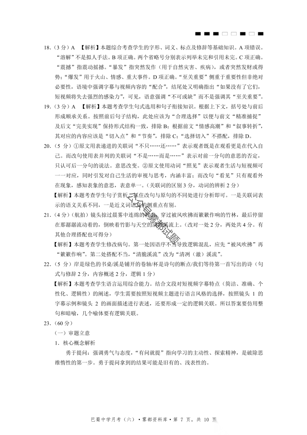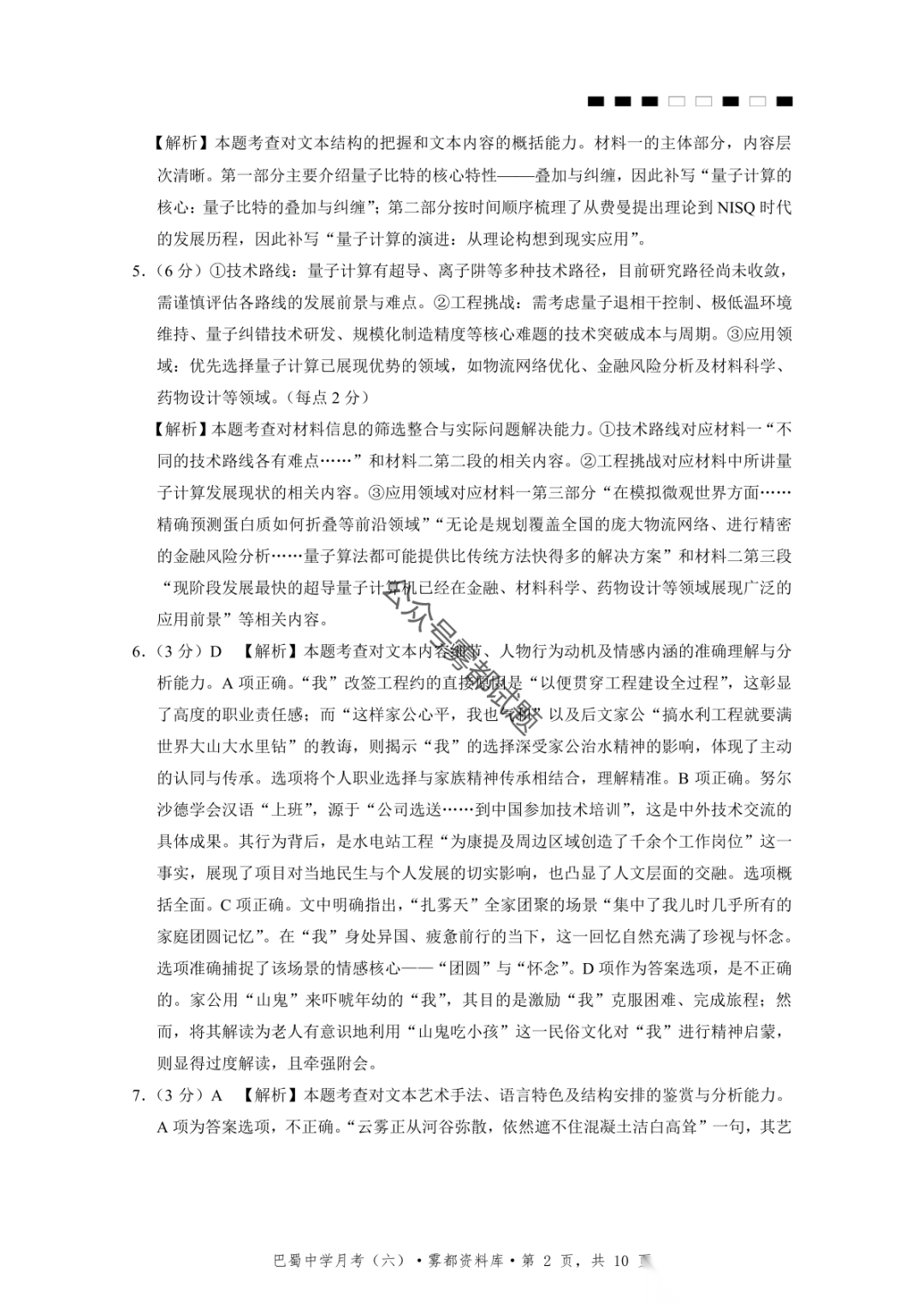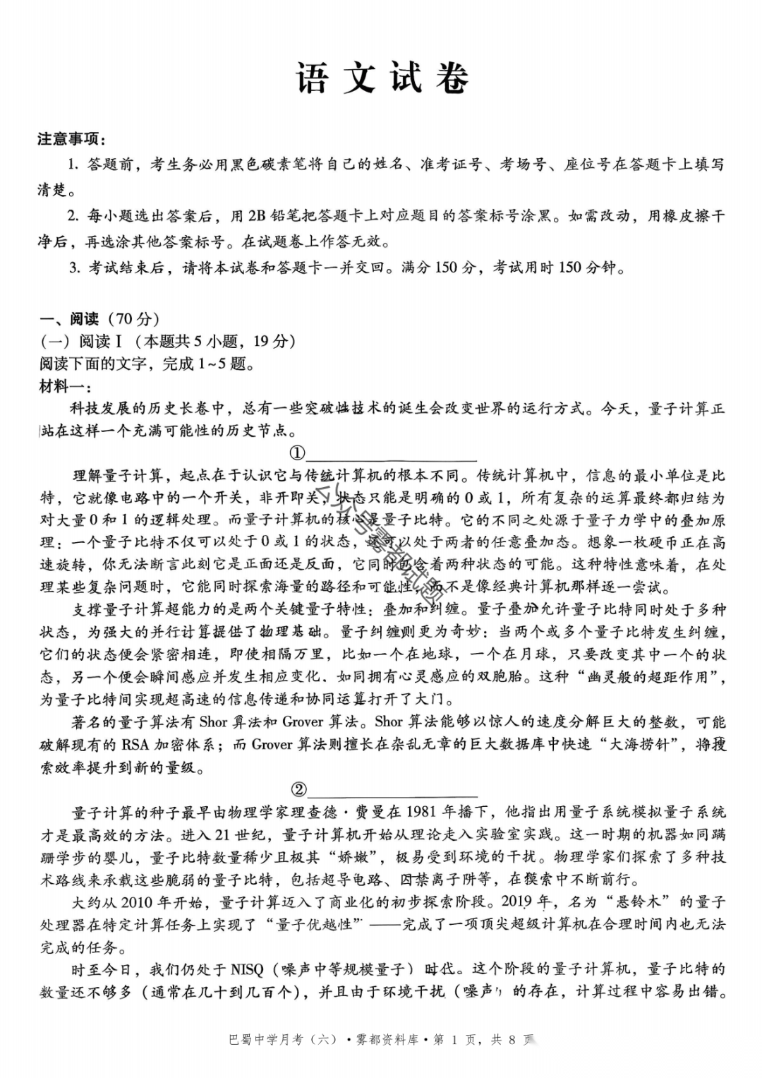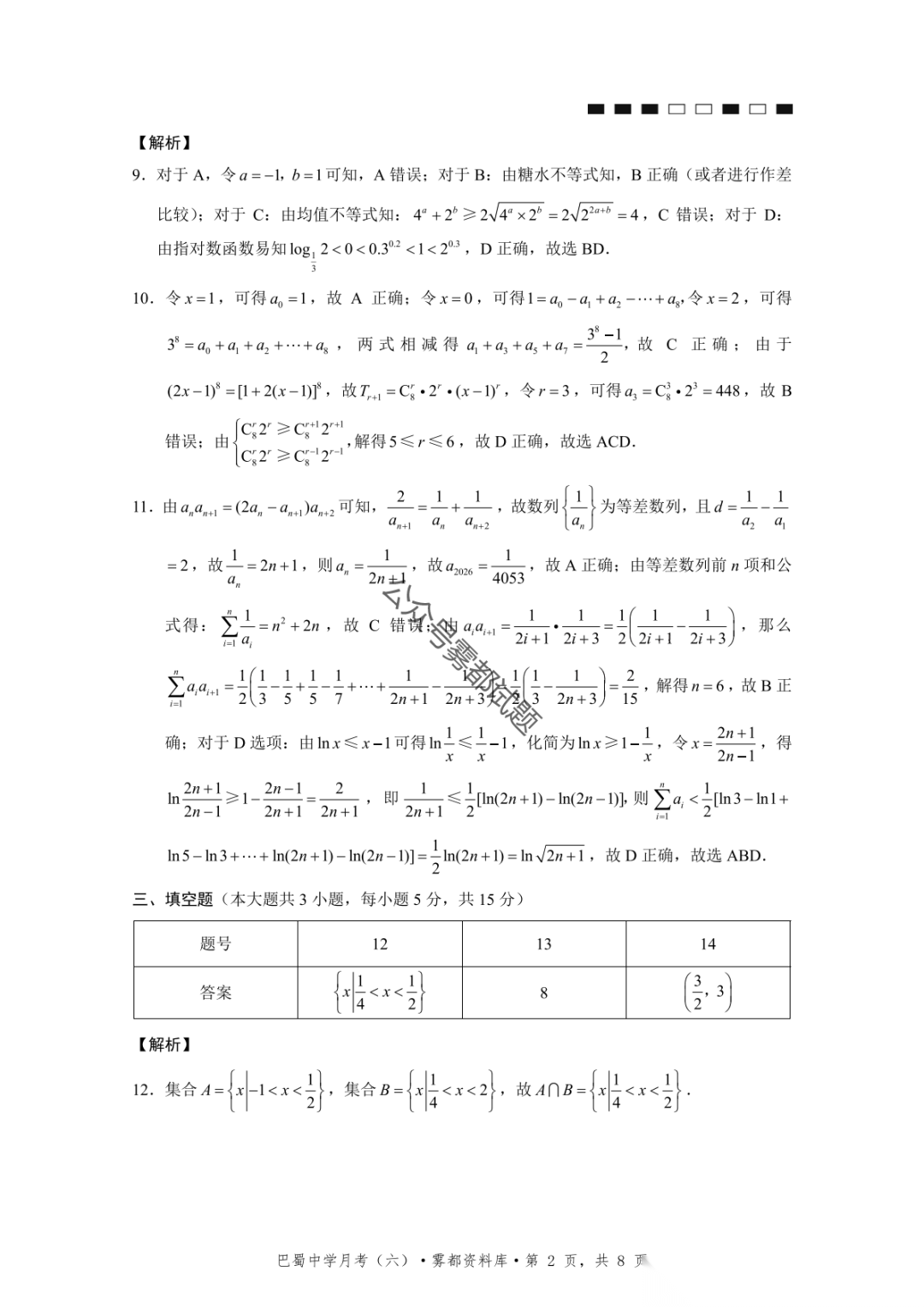 2026届重庆市巴蜀中学高三1月月考卷(五)语文、数学试卷及参考答案