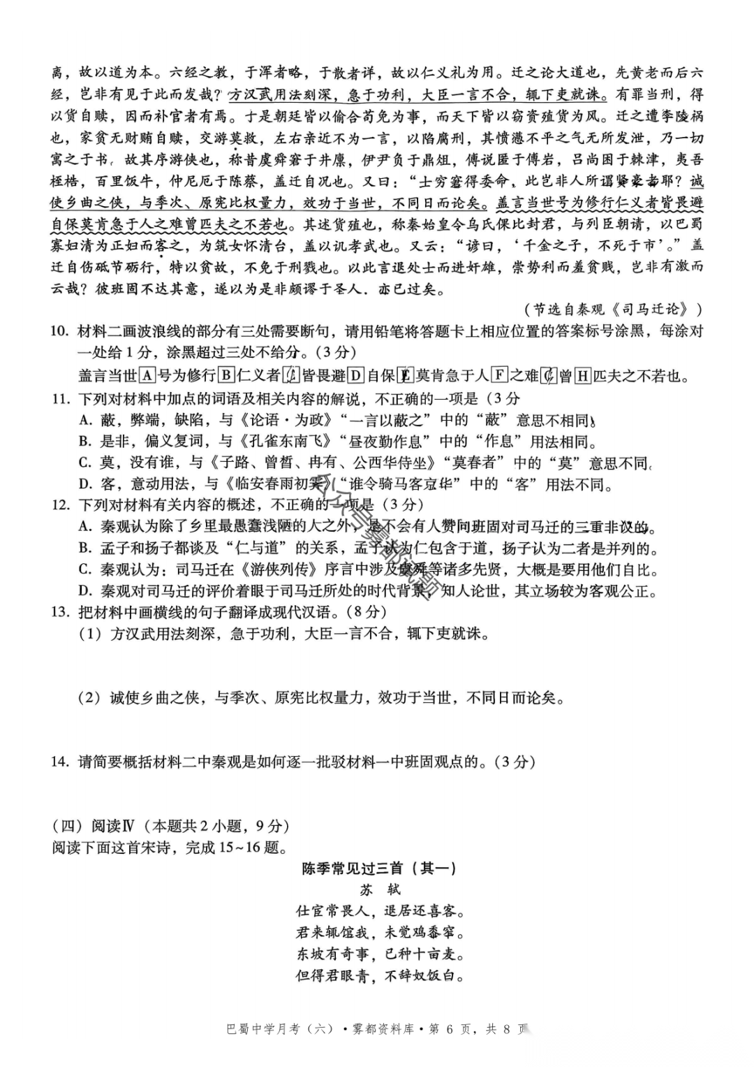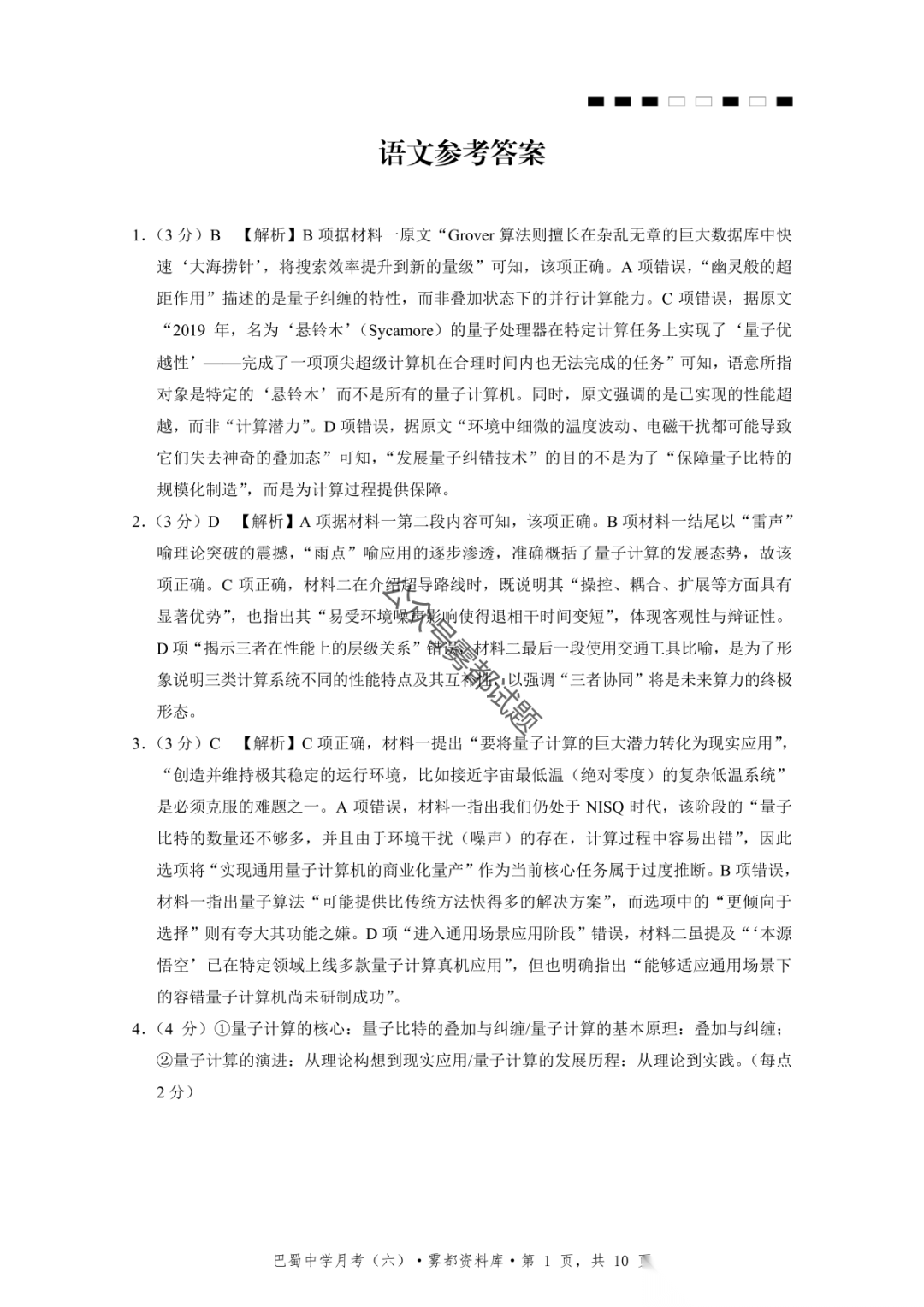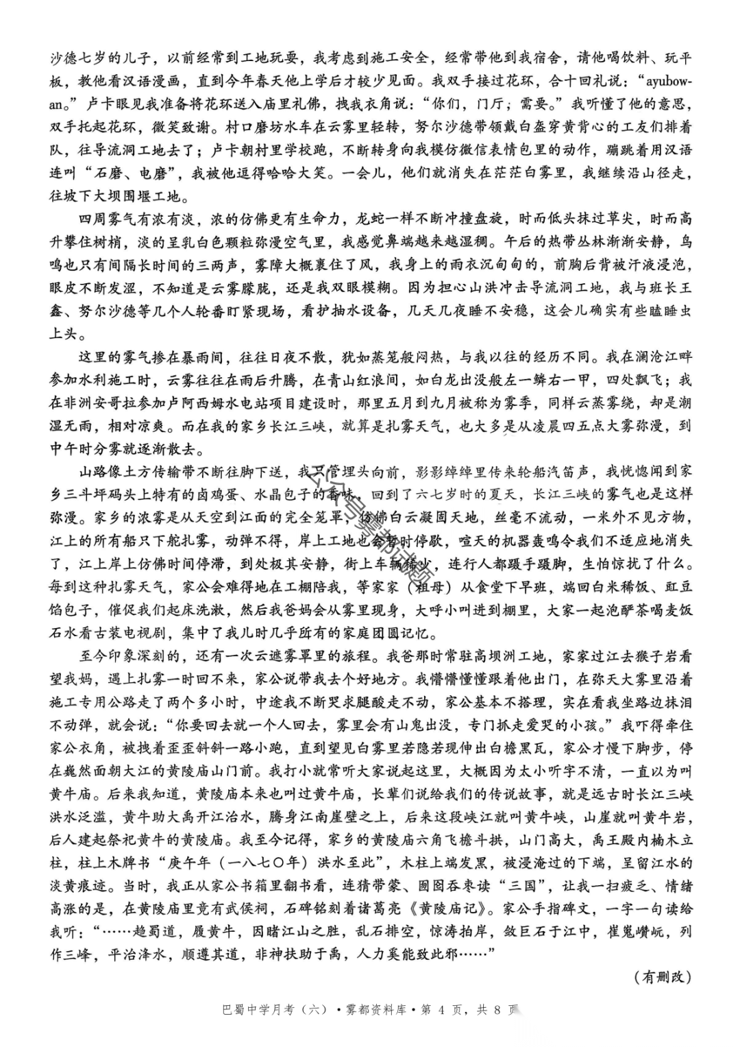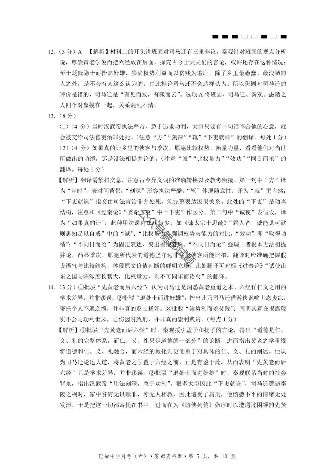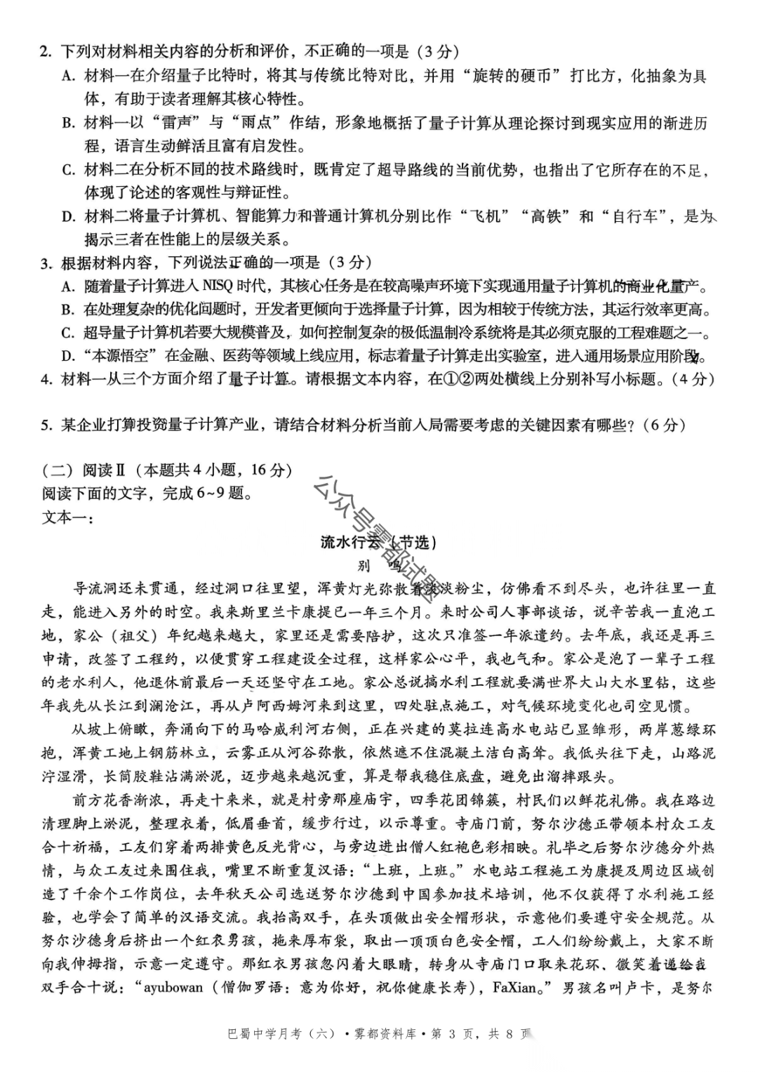 2026届重庆市巴蜀中学高三1月月考卷(五)语文、数学试卷及参考答案