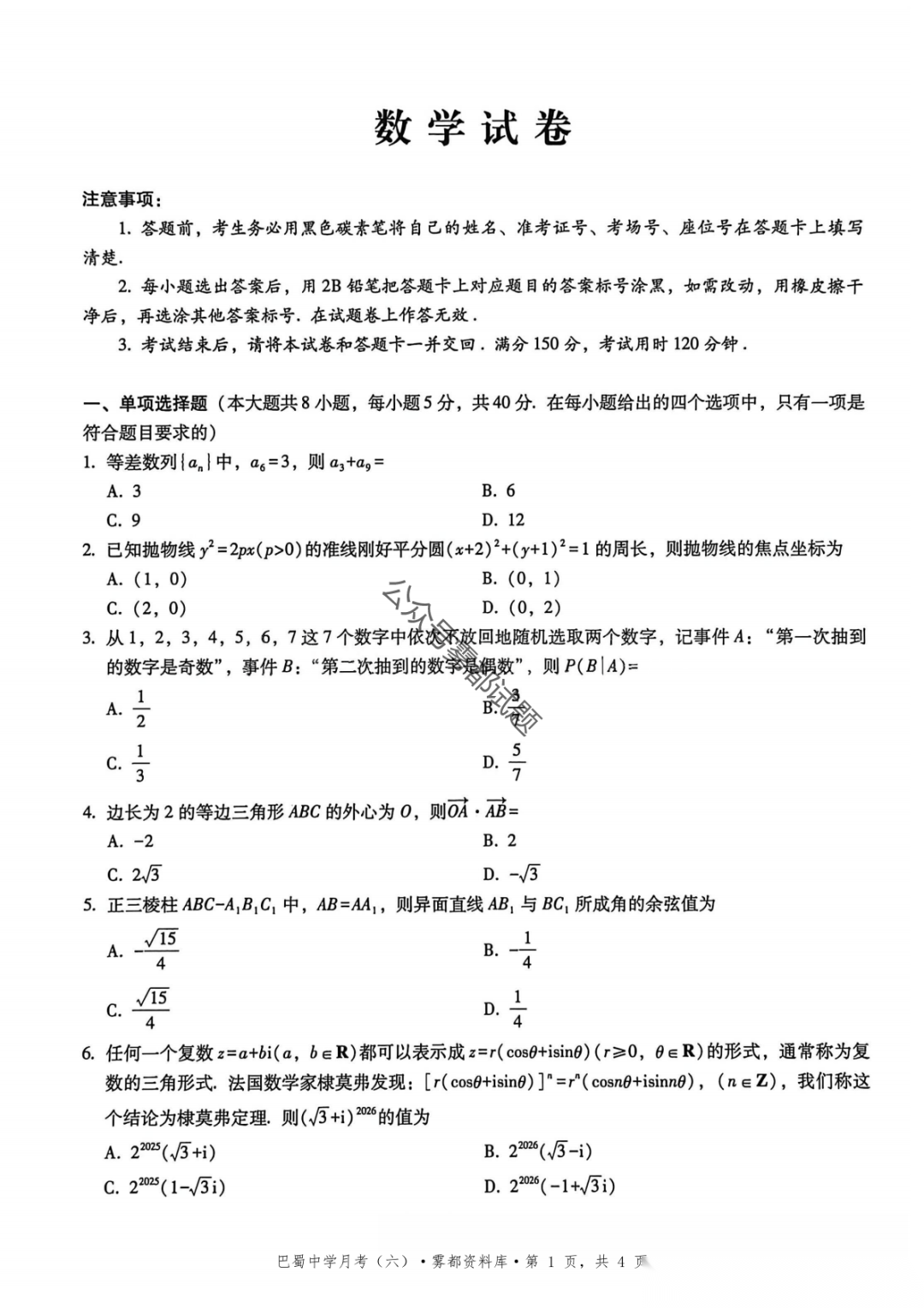 【广安一诊全科】广安市高2026届高三第一次模拟考试【广安一诊全科】广安市高2026届高三第一次模拟考...