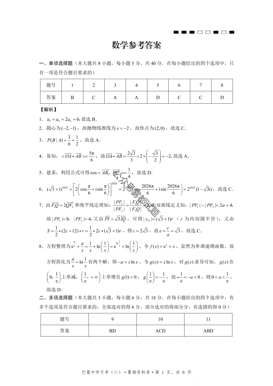【全科】重庆市第八中学2026届高三1月高考适应性月考卷五(一诊)【全科】重庆市第八中学2026届高三1月高考适应性...