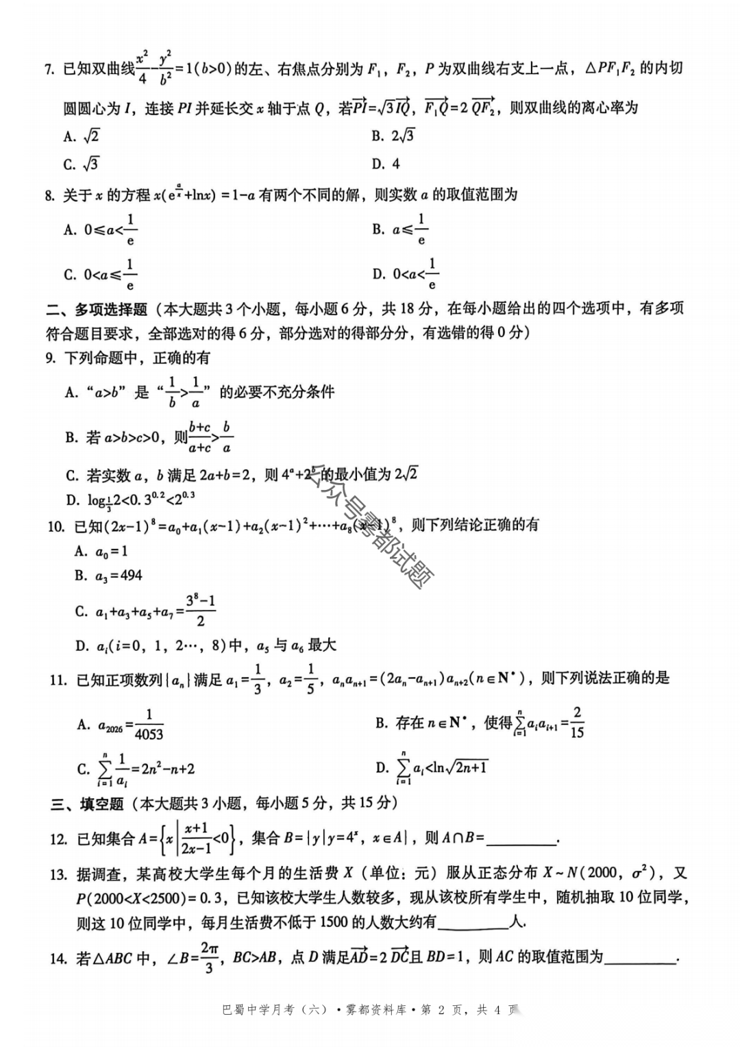 【全科】巴中市普通高中2026届高三一诊模拟考试【全科】巴中市普通高中2026届高三一诊模拟考试