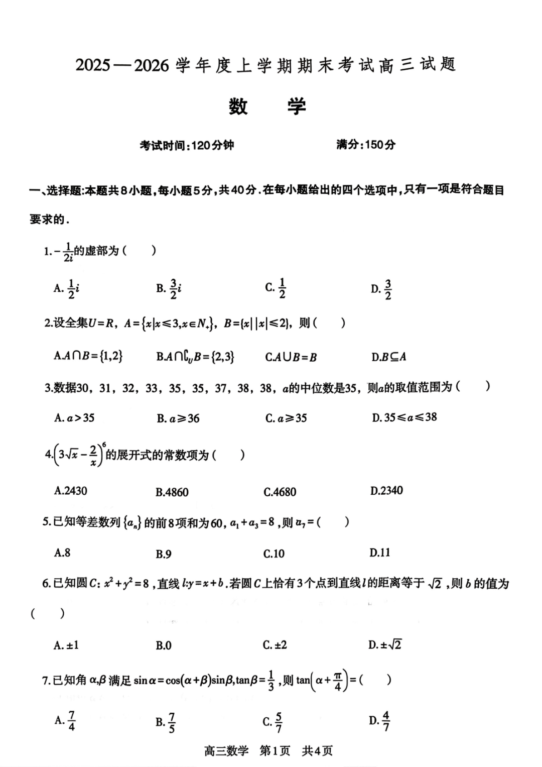 【全科】2025-2026学年度上学期辽宁省辽南协作体高三期末考试