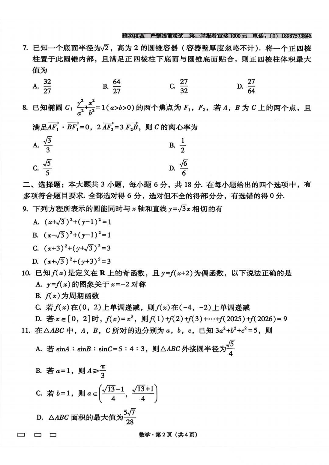 重庆八中2026届高考适应性月考卷(五)数学试题重庆八中2026届高考适应性月考卷(五)数学试题