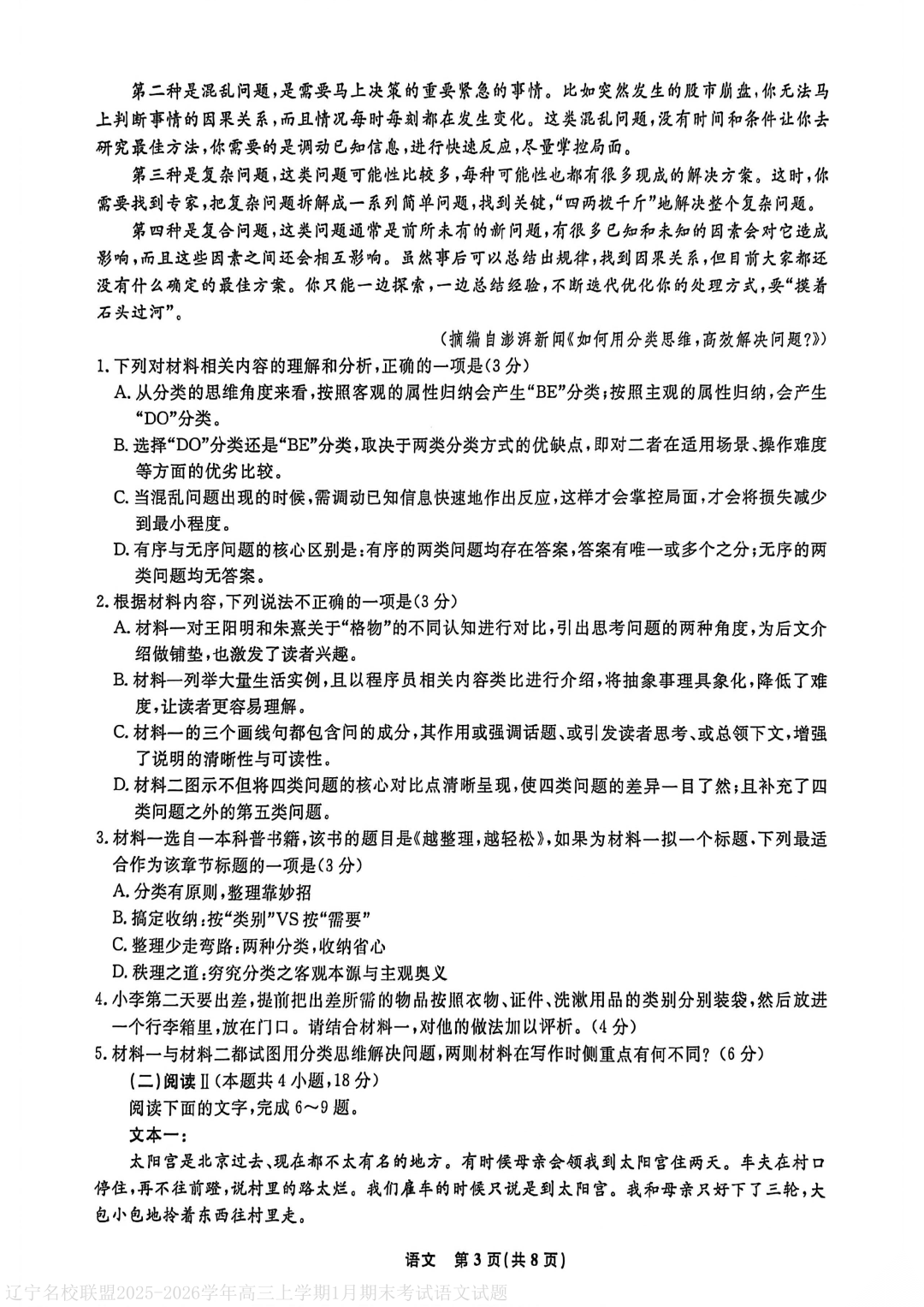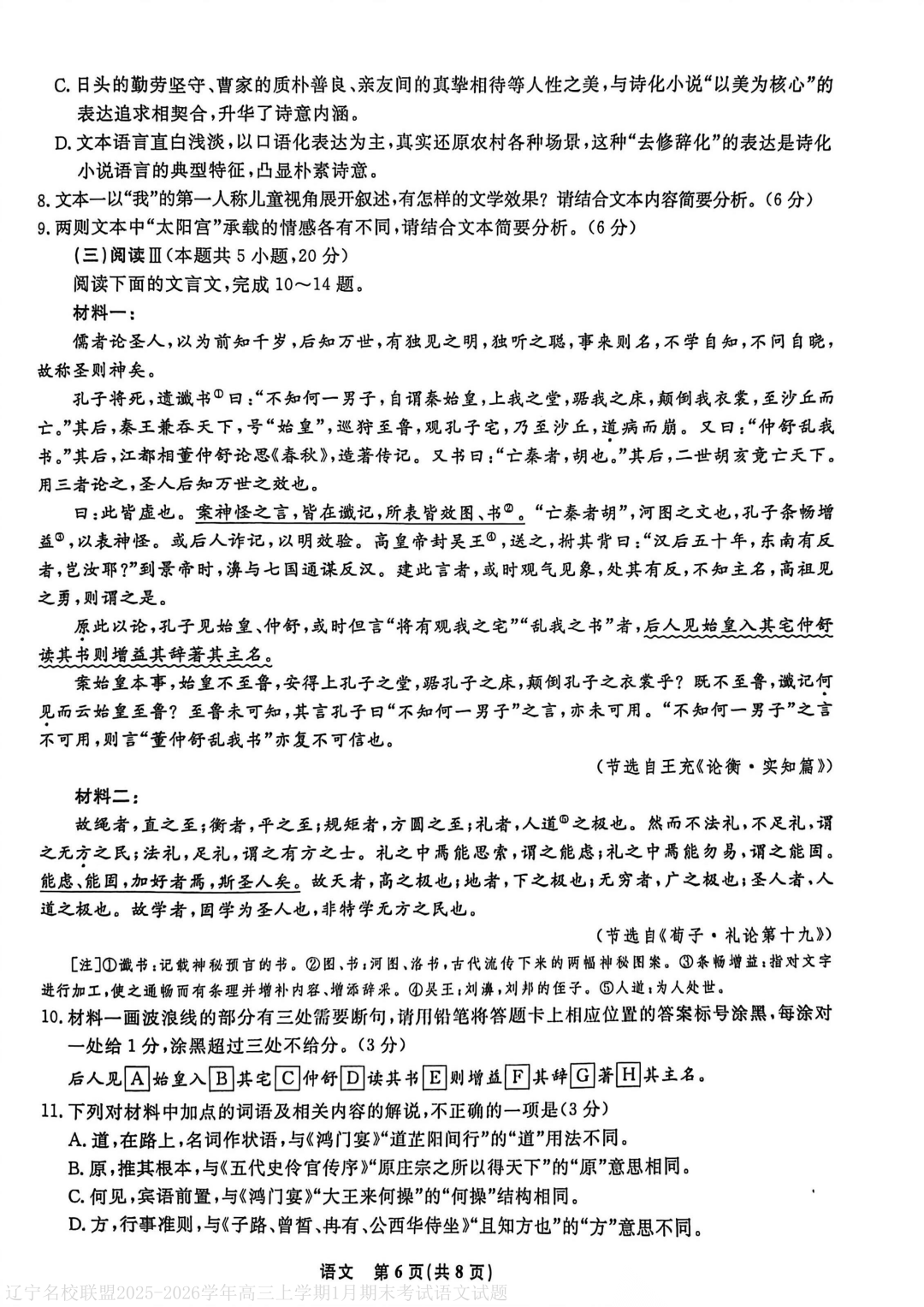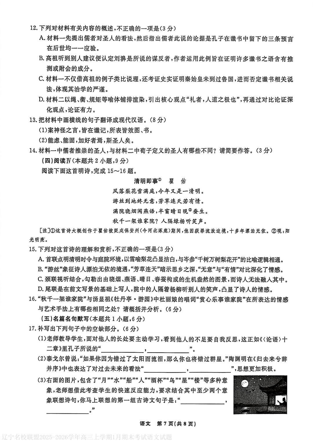 辽宁名校联盟2026届高三上学期1月期末考试语文物理