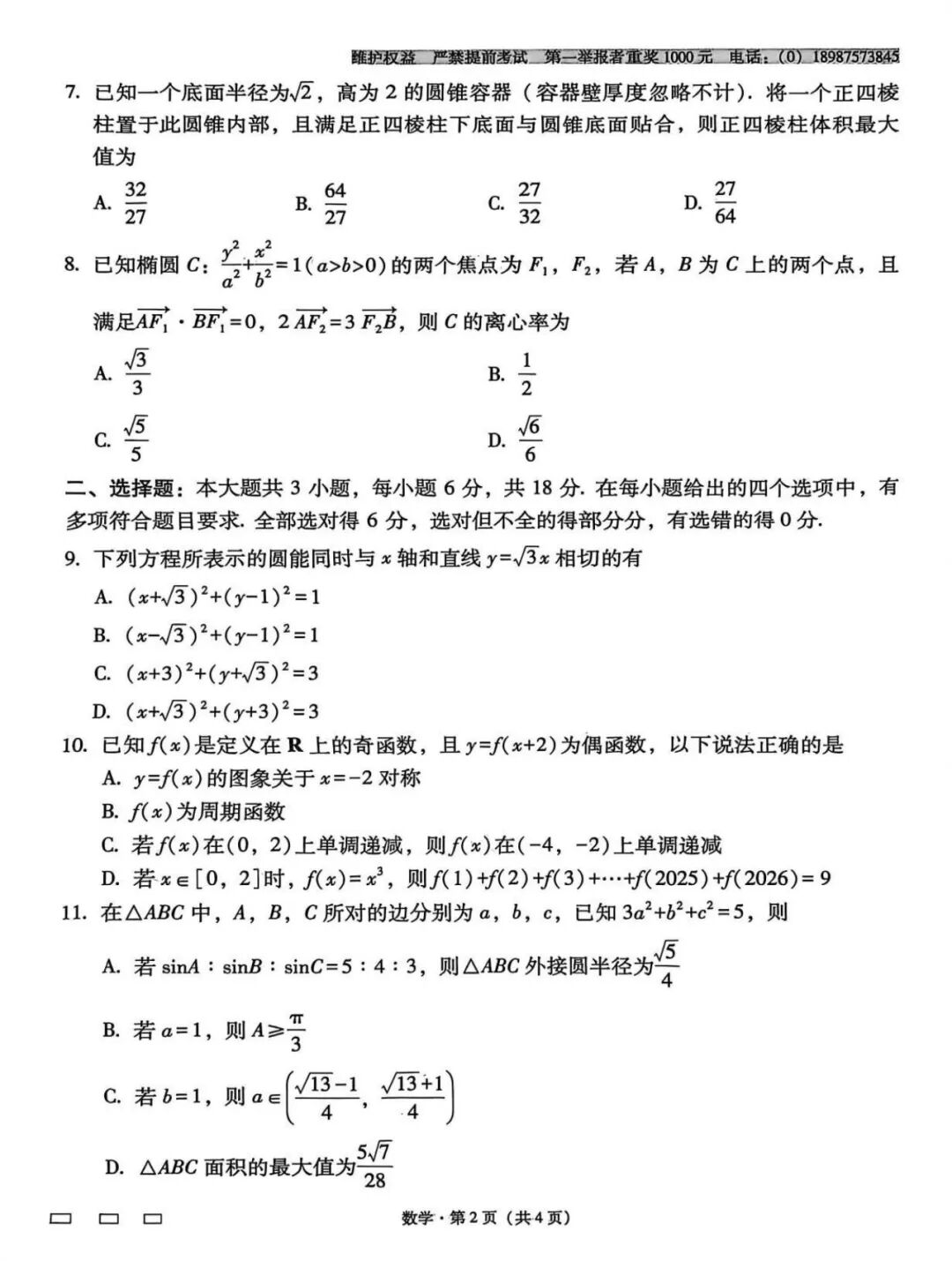 重庆八中2026届高考适应性月考卷(五)数学试题重庆八中2026届高考适应性月考卷(五)数学试题