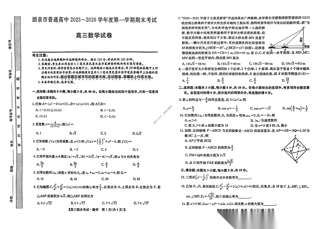 甘肃省酒泉市2026届高三上学期期末考试语文数学