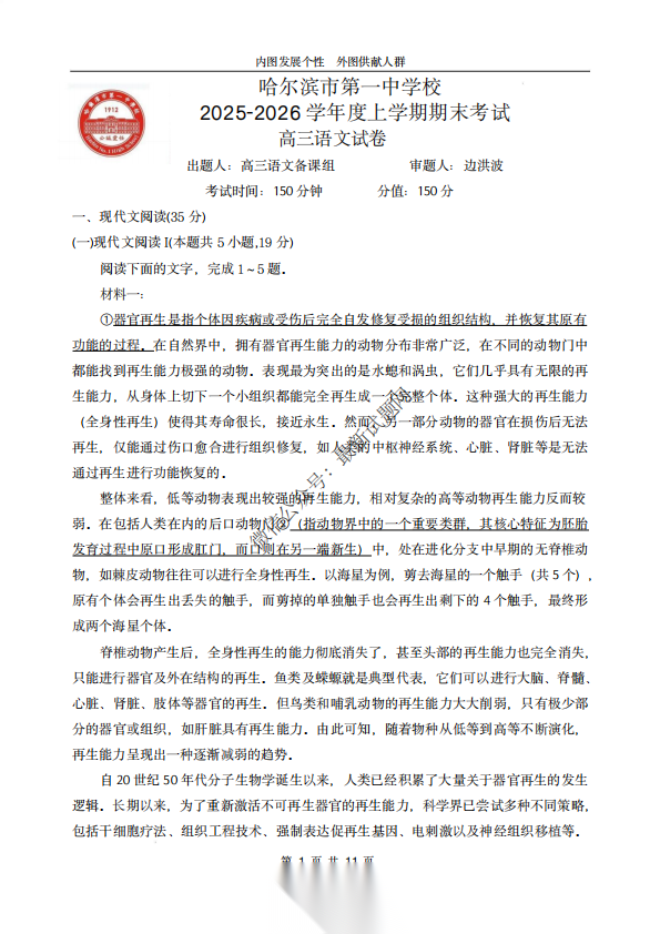 黑龙江省哈尔滨市第一中学校2026届高三上学期1月期末考试语文