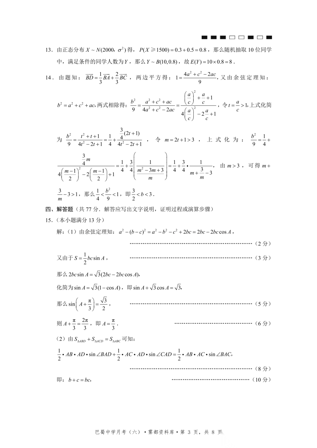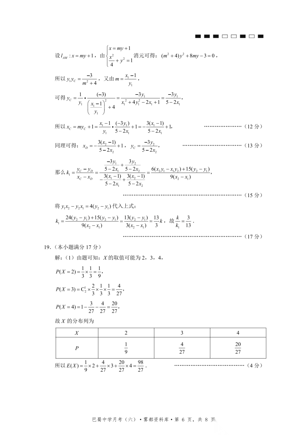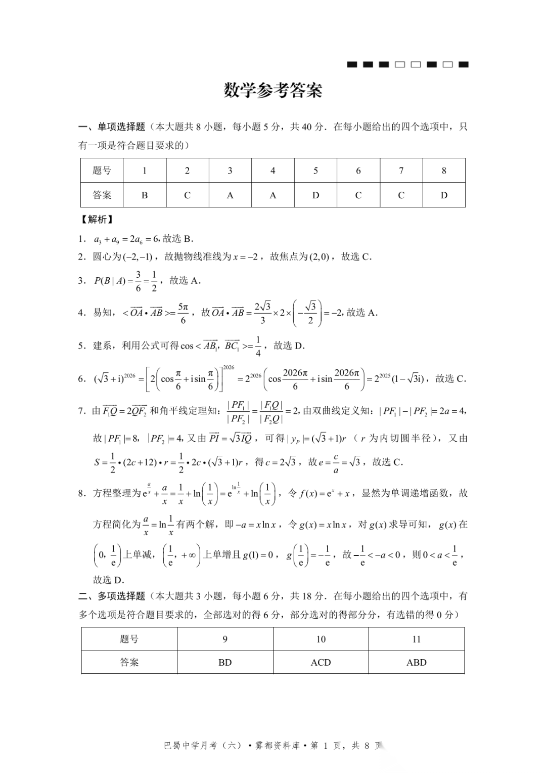 【全科】重庆市巴蜀中学高三一模·暨1月高考适应性月考卷(六)