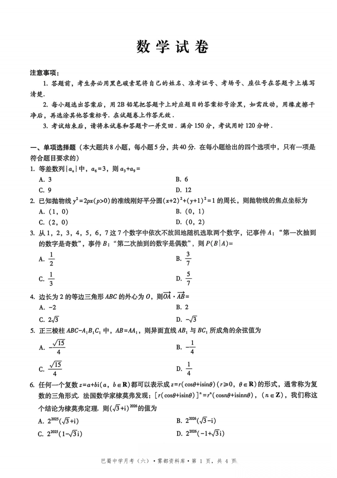 黑龙江省哈尔滨市第九中学校2026届高三上学期1月期末考试语文数学黑龙江省哈尔滨市第九中学校2026届高三上学期1月...