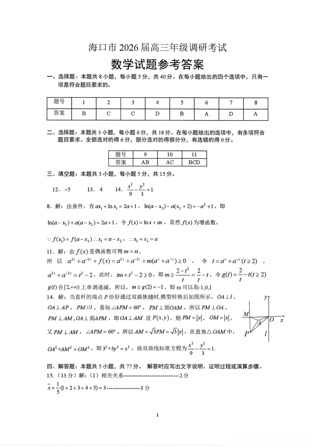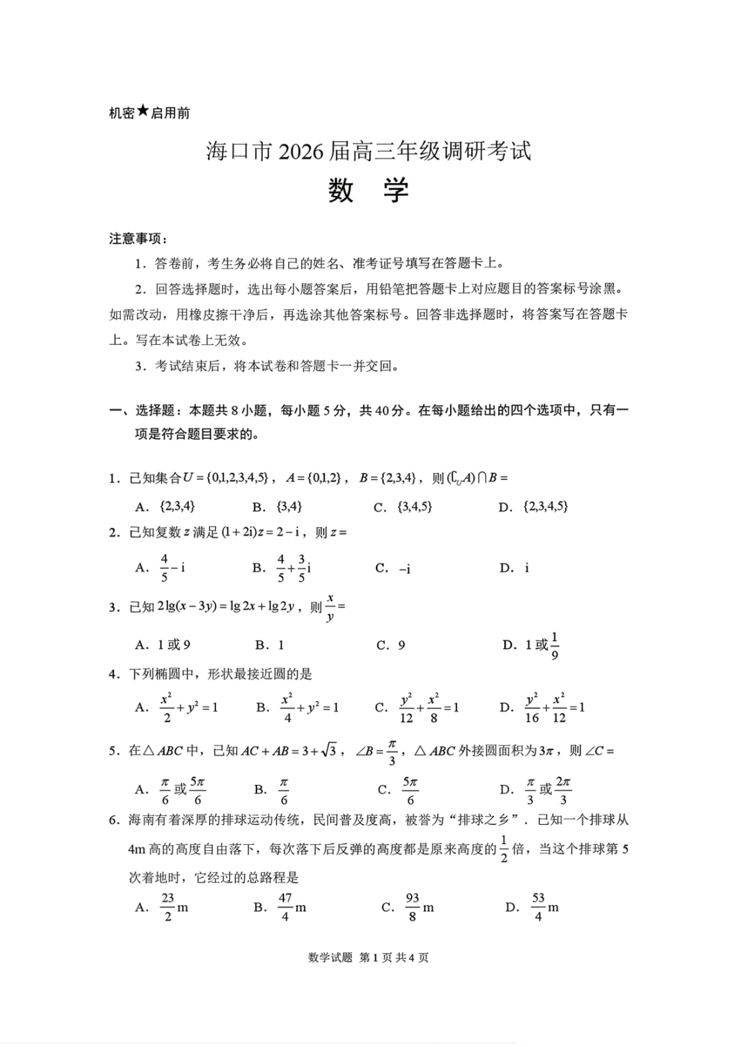 【海口一模全科】海口市2026届高三年级1月调研考试