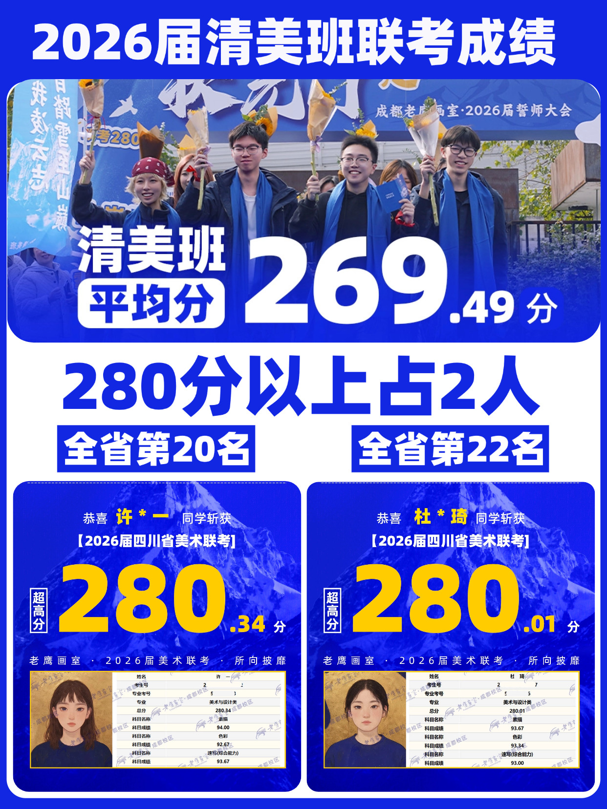 成都老鹰画室清美班联考平均分269.49,92%学生突破260分