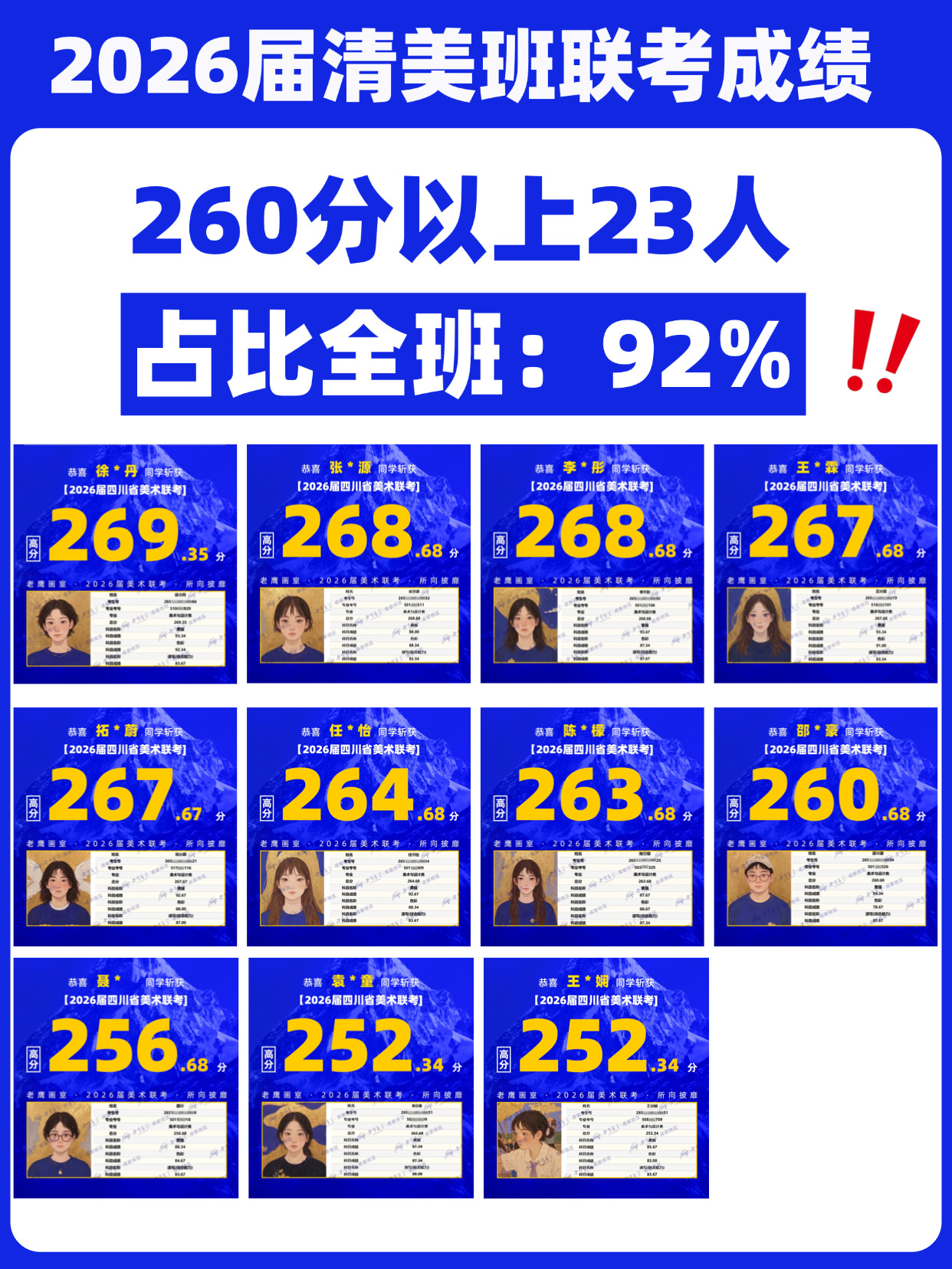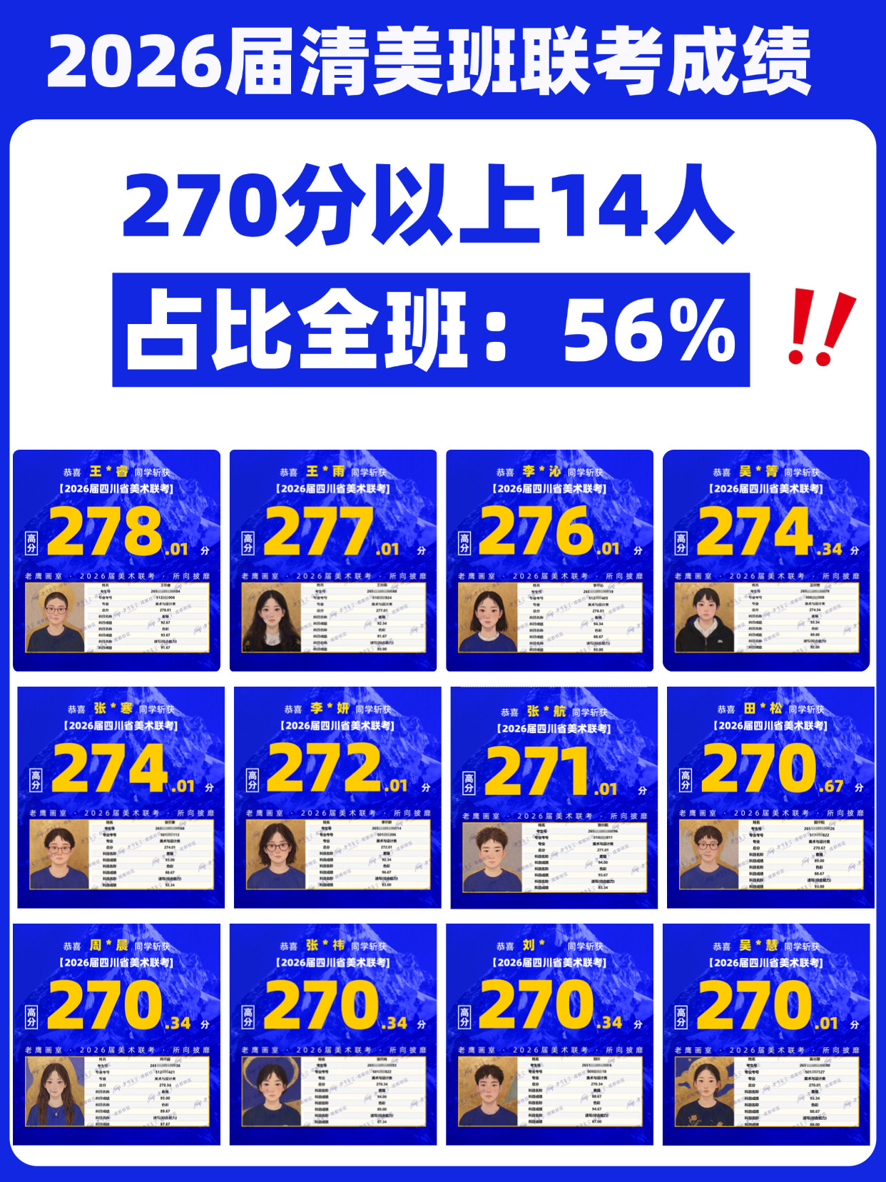 2026-01-25 17:18:31文/刘开秀2025年12月31日,四川省2026届美术联考成绩与五分一段表正式公布。成都老鹰画室不仅斩获286.67人全省状元,班级文化平均分580+的清美班再次交出令人瞩目的成绩单:全班25人参考,平均分高达269.49分,其中260分以上学生达23人,占比92%。更有多名学生跻身全省前列,展现出扎实的专业功底与整体强劲的应试实力。