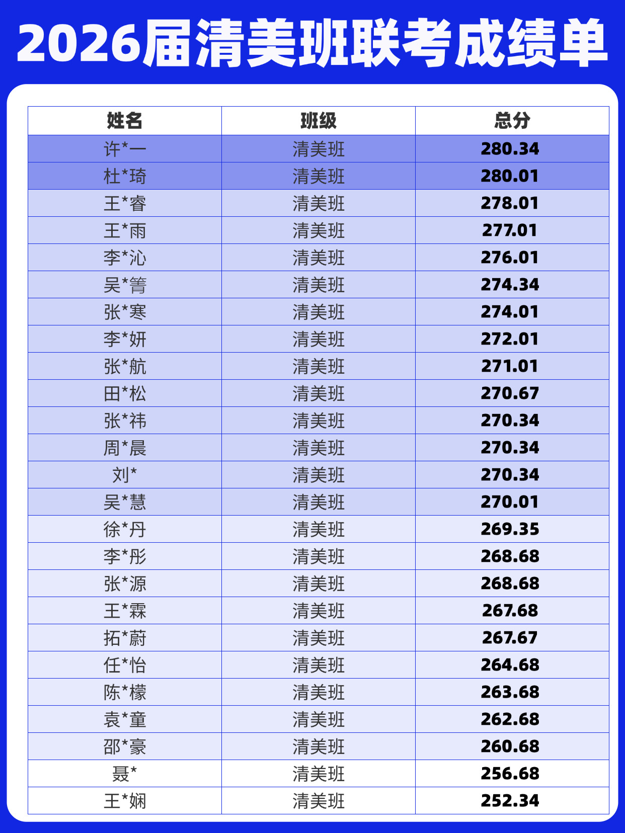 - 顶尖分数突出:许*一、杜*琦两位同学分别以280.34分和280.01分的优异成绩,位列全省第20名与第22名,成为班级的分数领跑者。