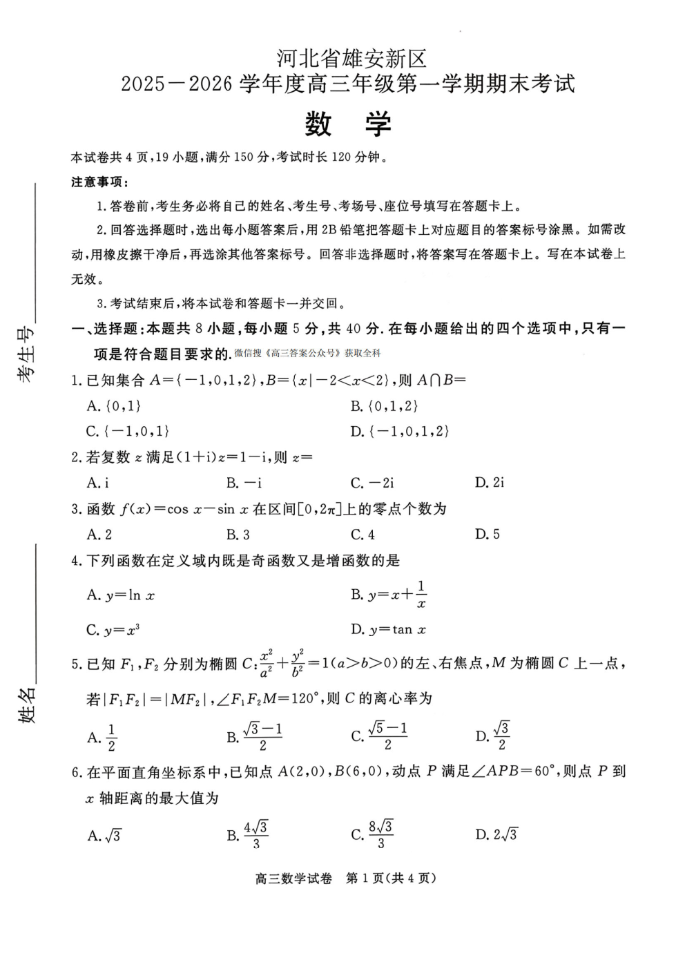 河北省雄安新区2025-2026学年度高三期末考试答案