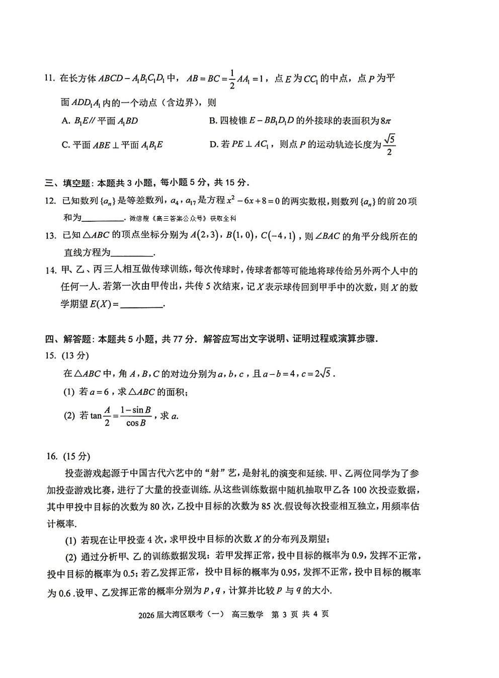 2026届大湾区高三联合模拟考试一答案