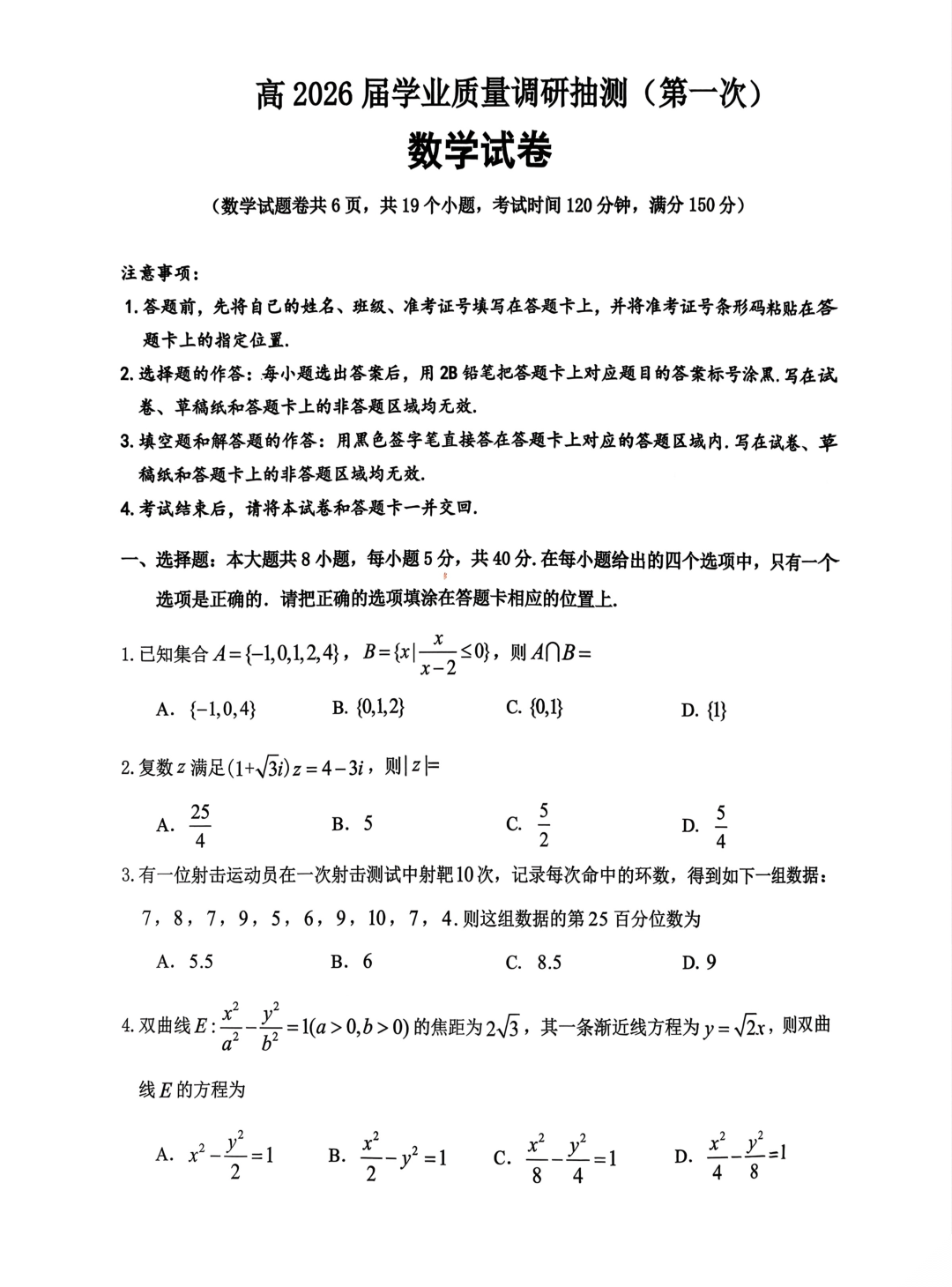广东省汕头市2026届高三上学期1月教学质量监测数学试卷广东省汕头市2026届高三上学期1月教学质量监测数...