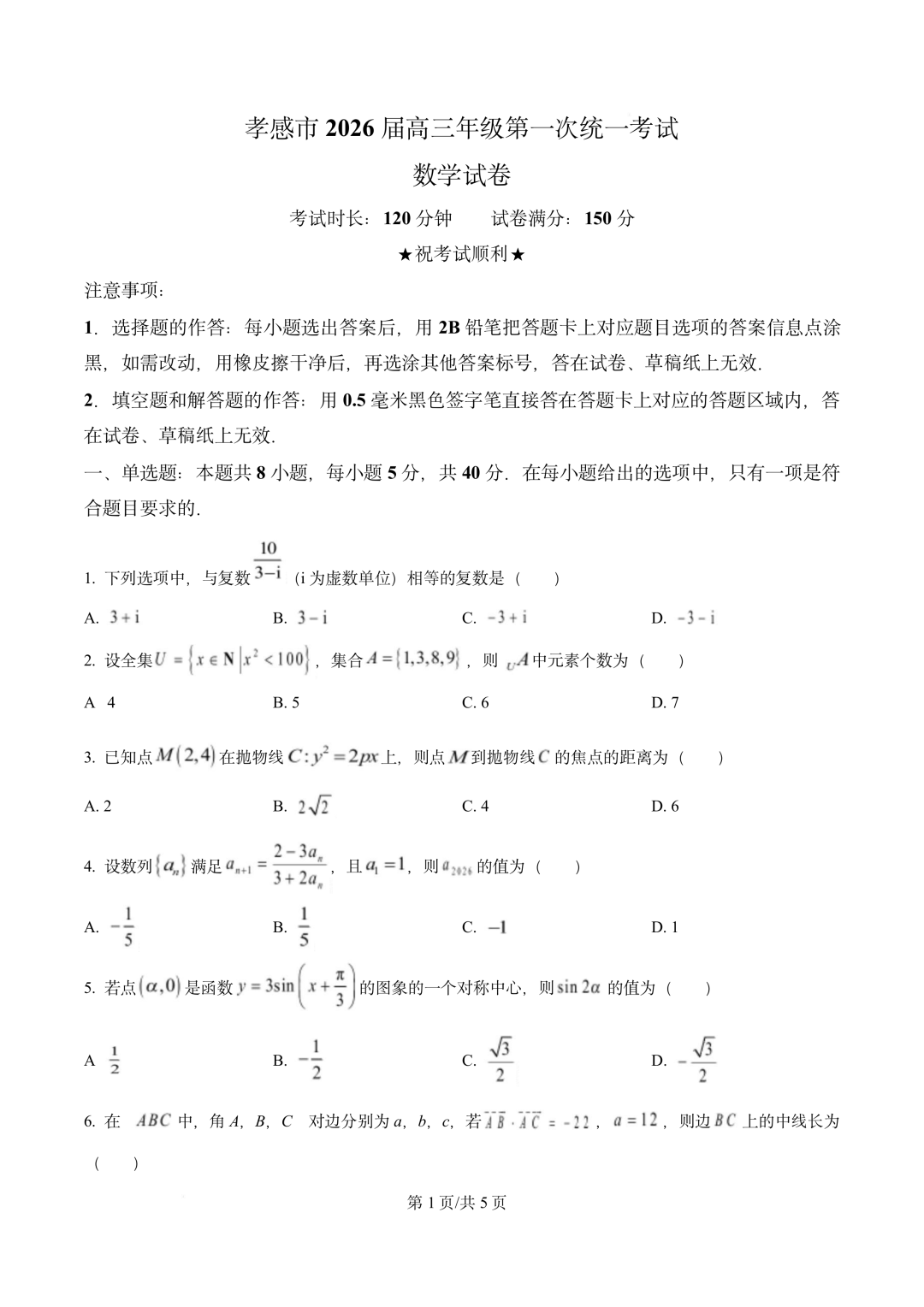 湖北省孝感市2026届高三第一次统一考试(孝感一模)