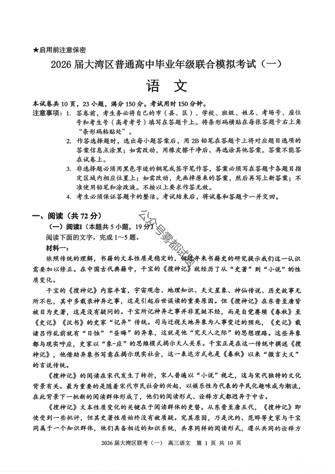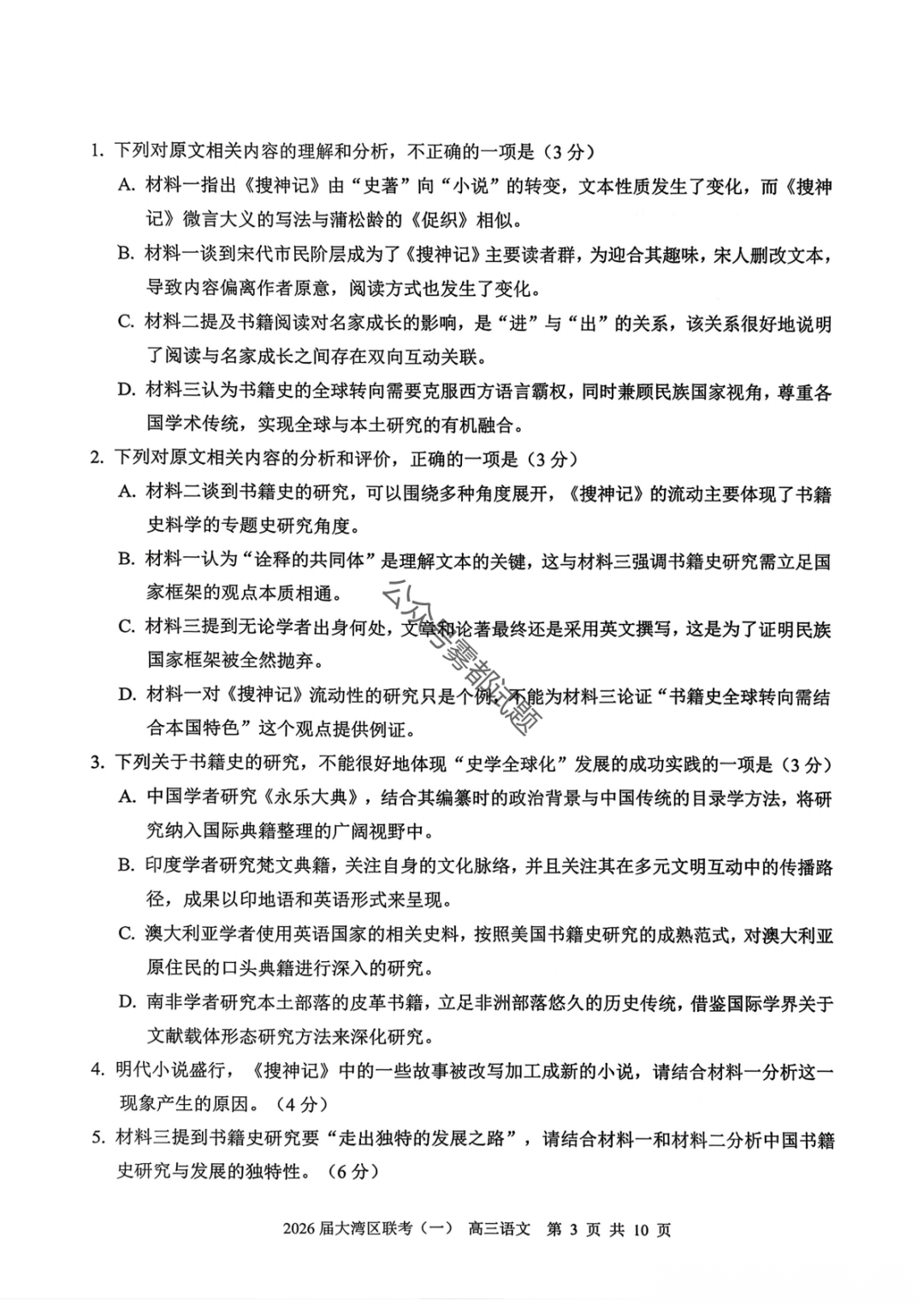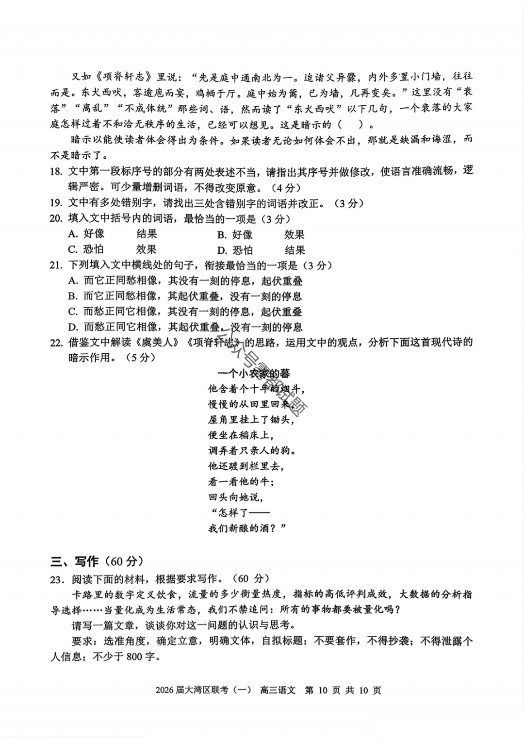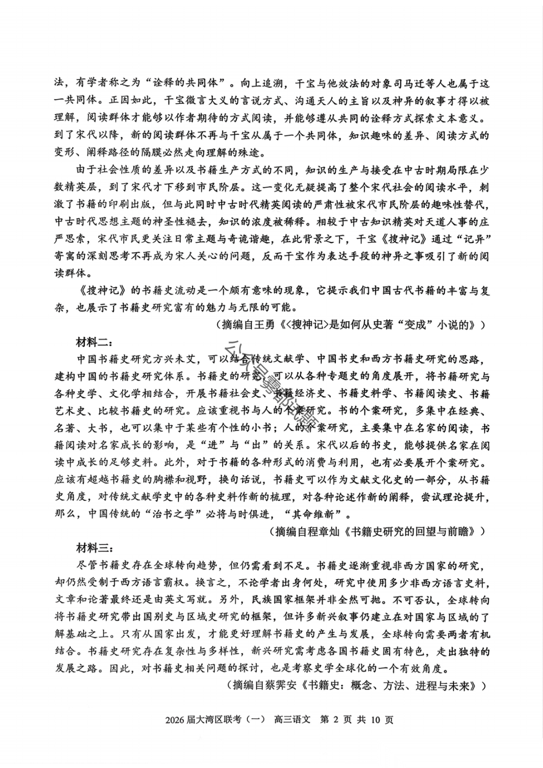 2026届大湾区普通高中毕业年级联合模拟考试(一)第一天科目(大湾区一模)