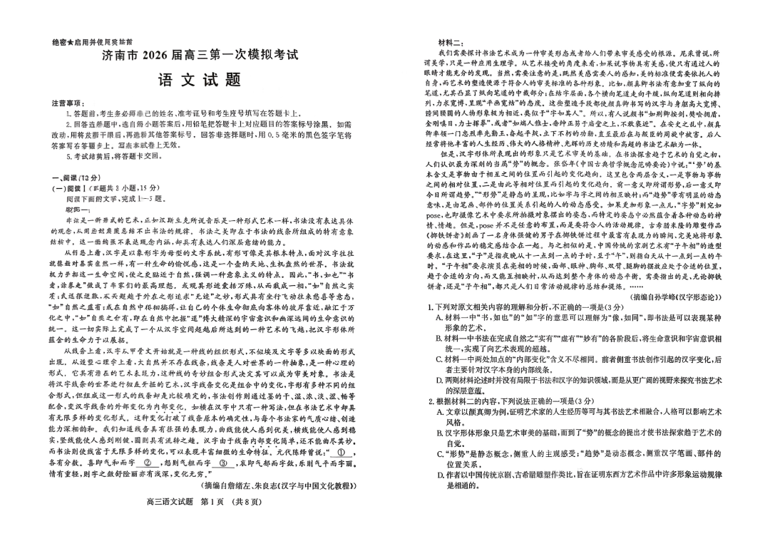山东省济南市2026届高三上学期第一次模拟考试(济南一模)语文试题
