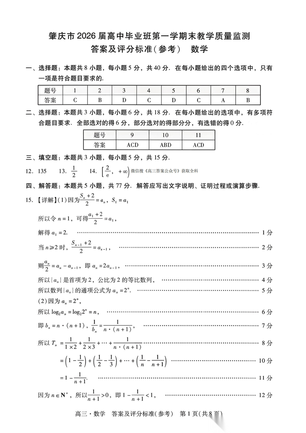 肇庆市2026届高三期末教学质量监测答案