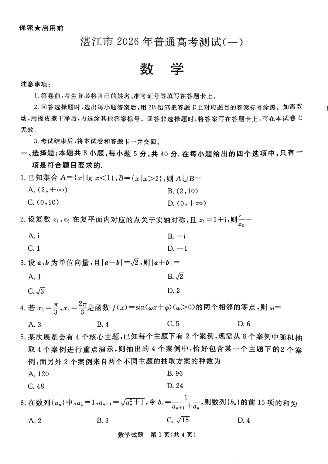 【湛江一模全科】湛江市2026年普通高考测试(一)
