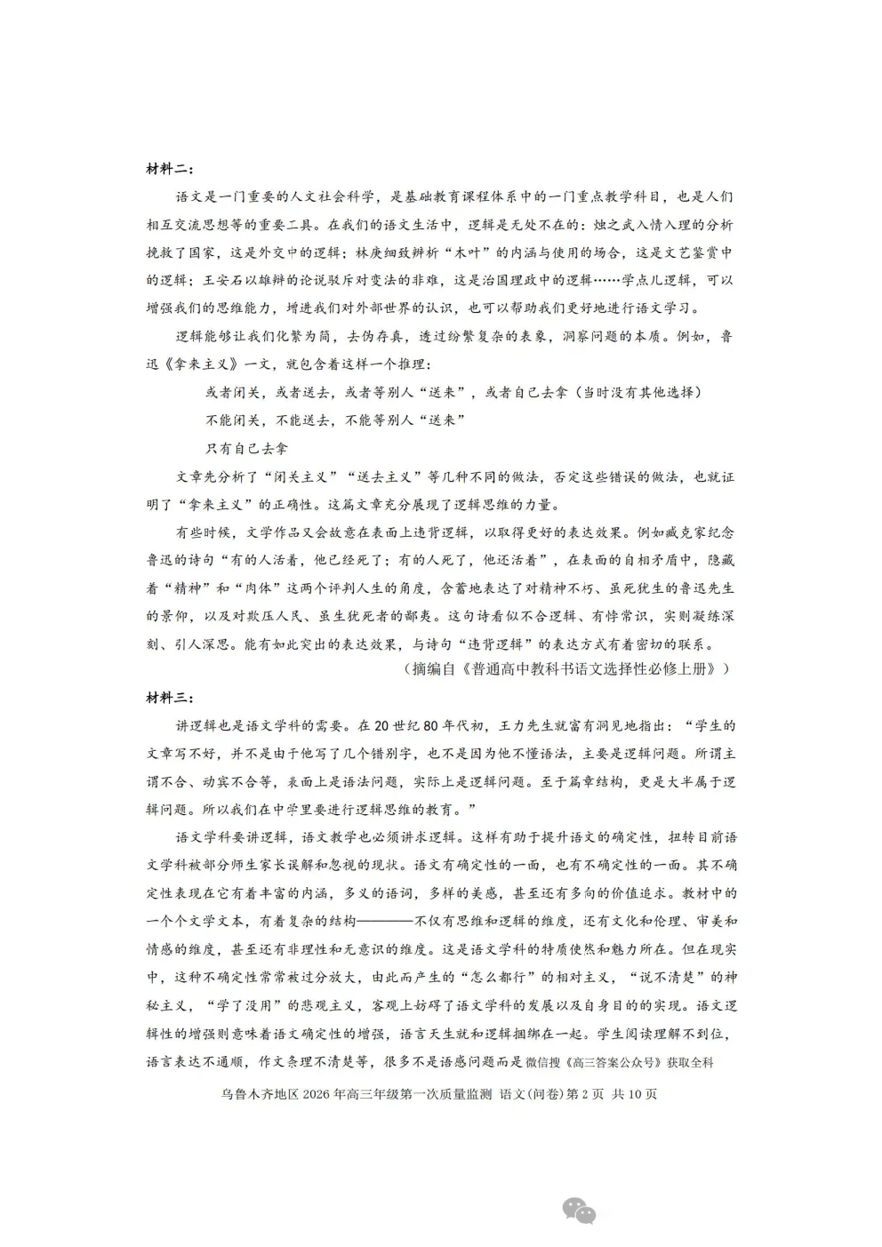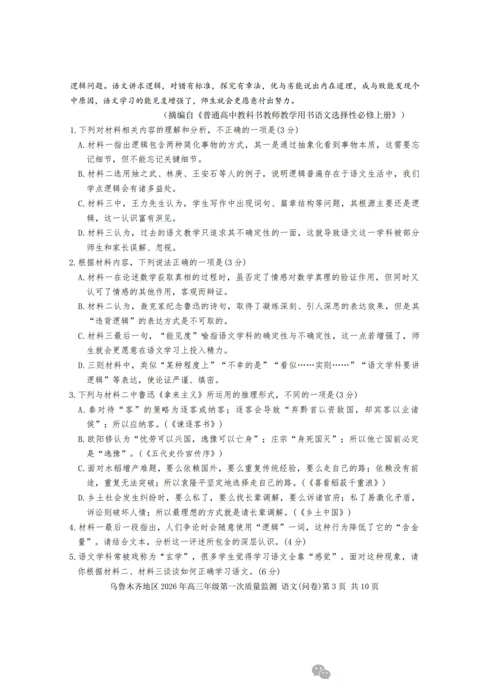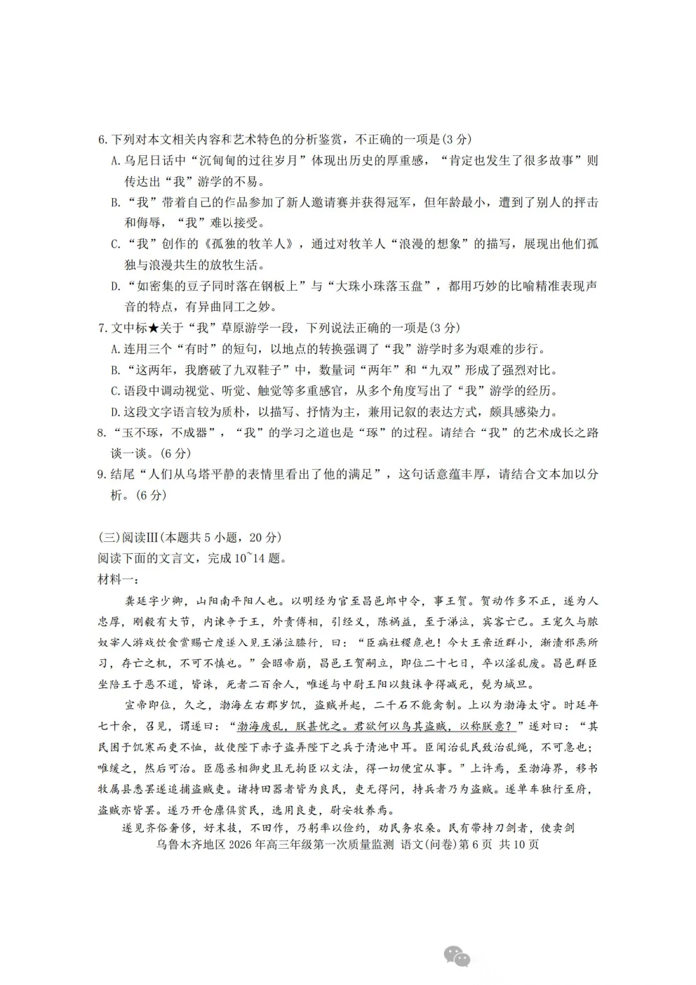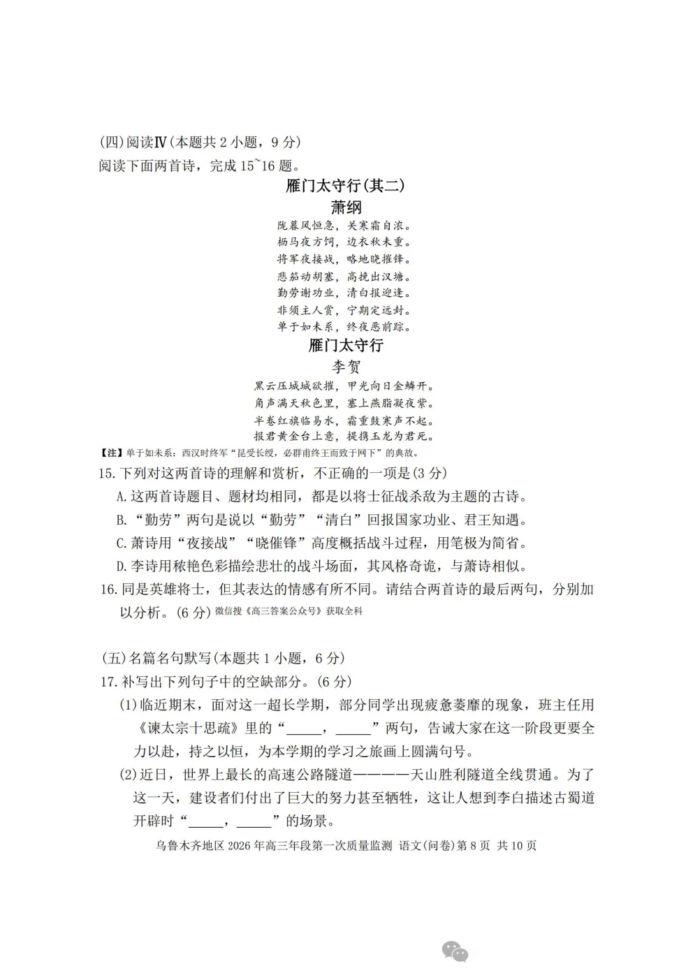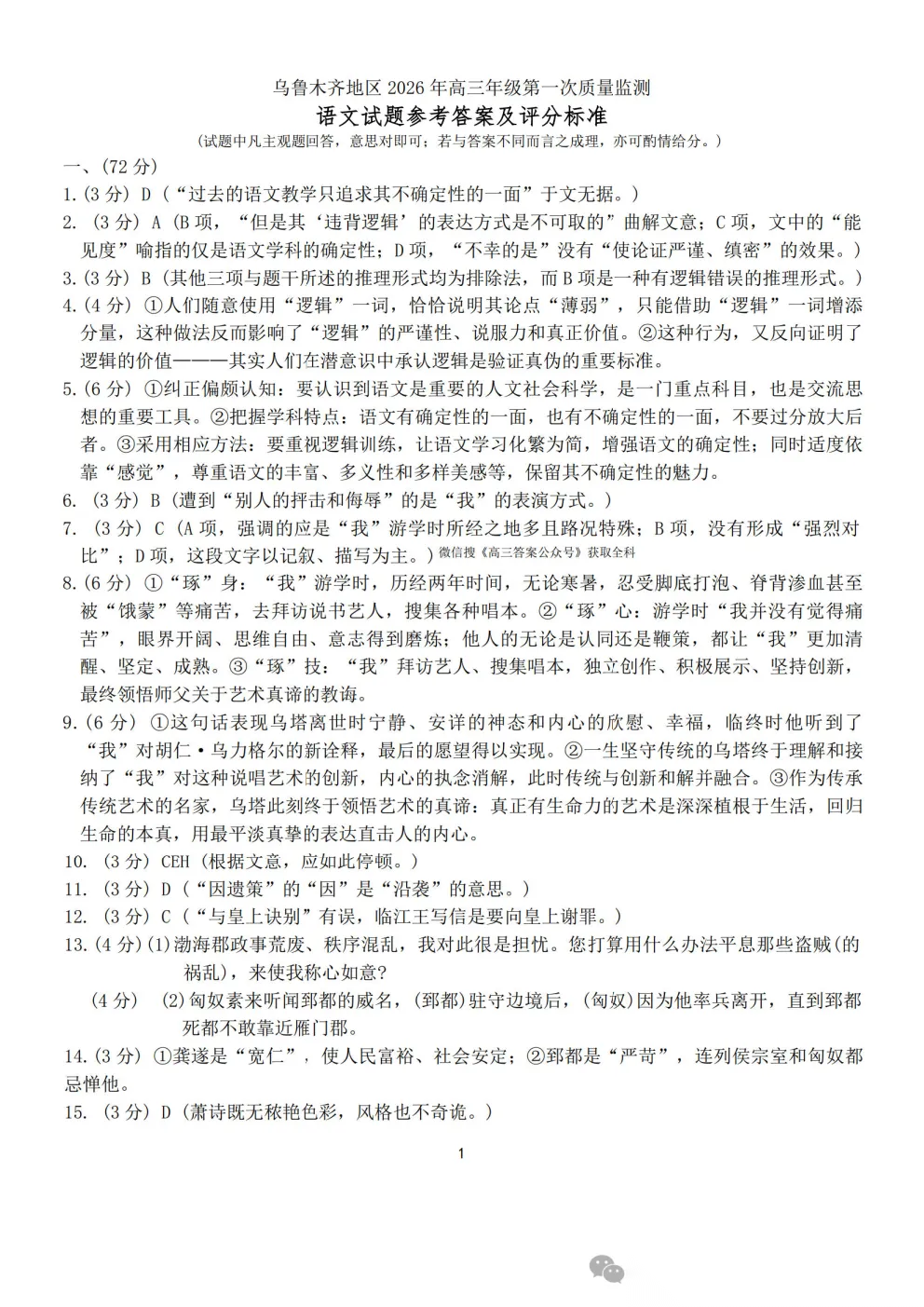 乌鲁木齐2026年高三年级第一次质量监测答案