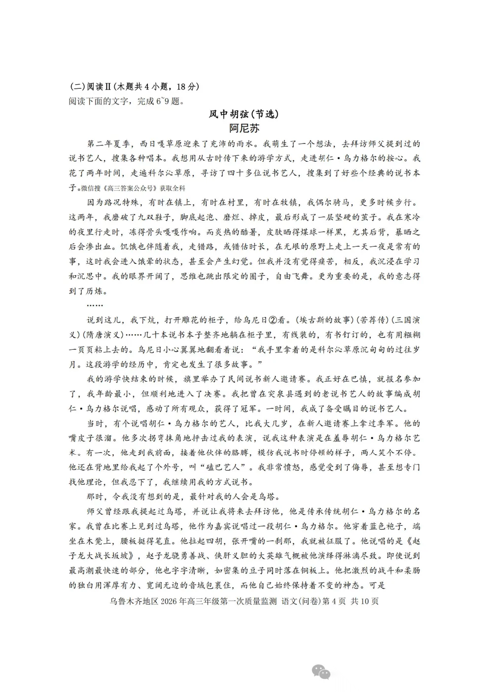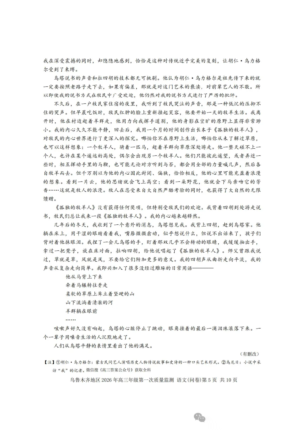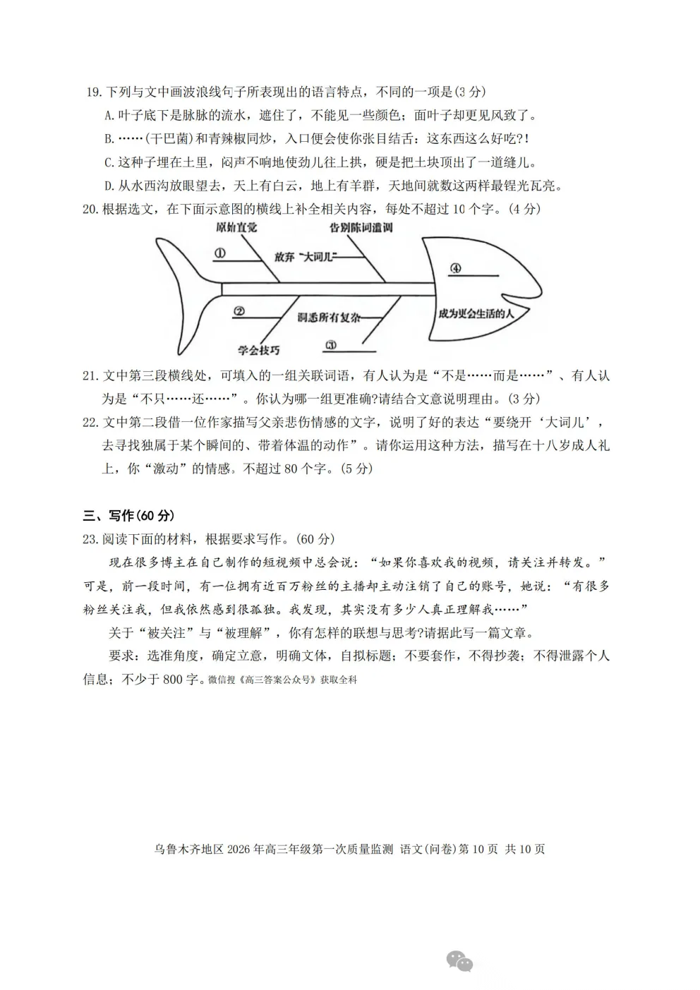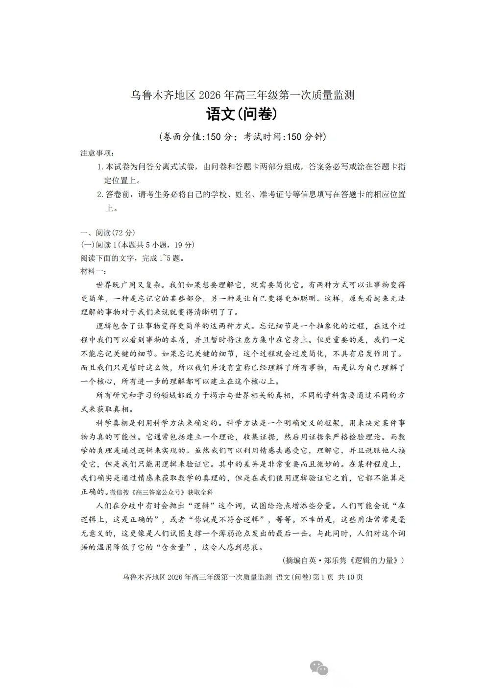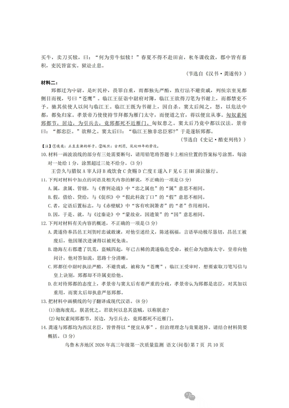 乌鲁木齐2026年高三年级第一次质量监测答案