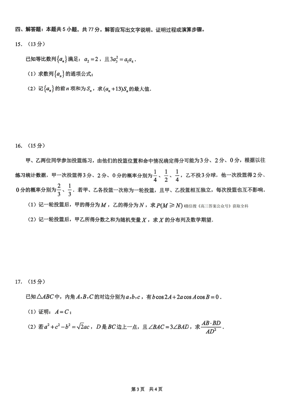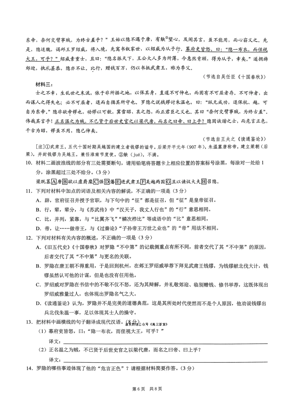 乌鲁木齐2026年高三年级第一次质量监测答案乌鲁木齐2026年高三年级第一次质量监测答案