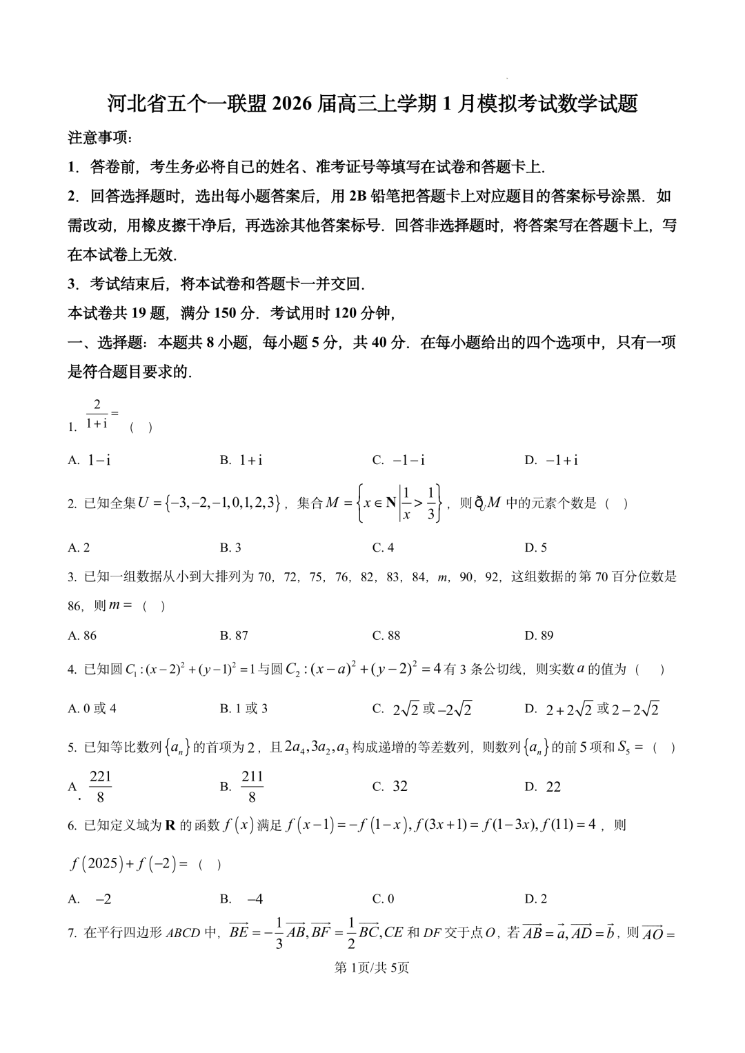 河北省五个一联盟2026届高三上学期1月模拟考试