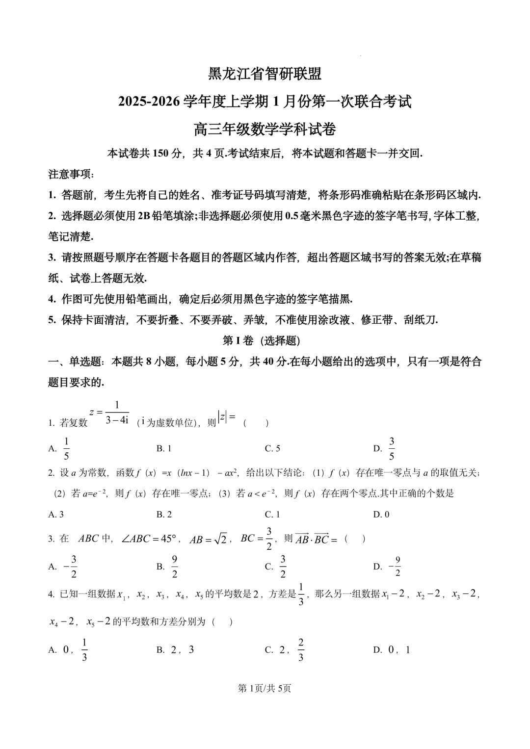 黑龙江省智研联盟2026届高三上学期1月份第一次联合考试
