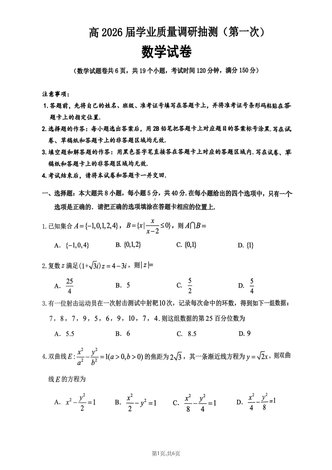 乌鲁木齐2026年高三年级第一次质量监测答案乌鲁木齐2026年高三年级第一次质量监测答案