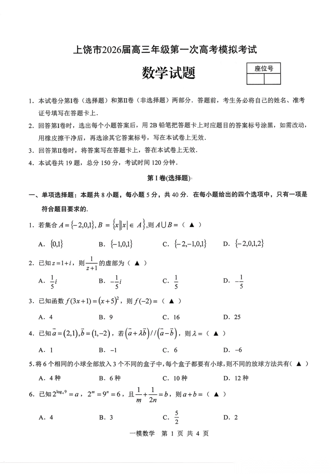 【上饶一模全科】江西省上饶市2026届高三年级第一次高考模拟考试