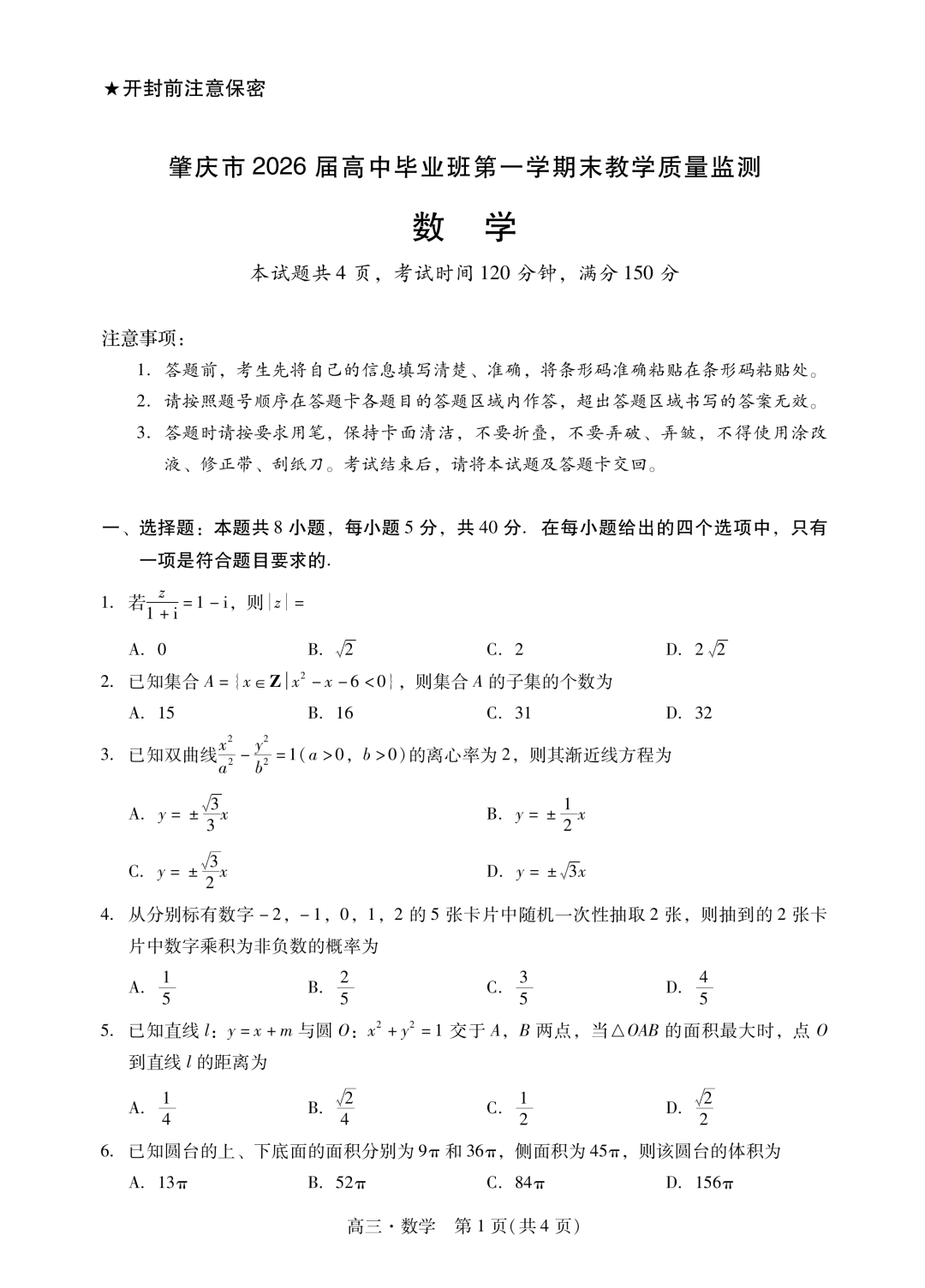 肇庆市2026届高三期末教学质量监测下载肇庆市2026届高三期末教学质量监测下载