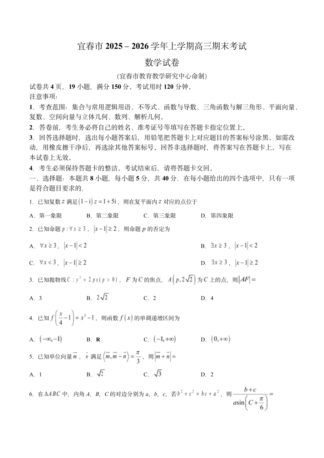 江西省宜春市2026届高三上学期1月期末考试