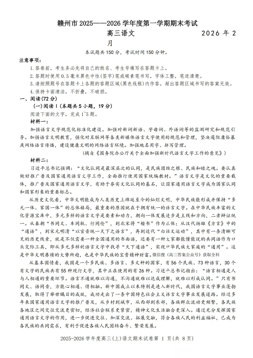 赣州市2025-2026学年度高三期末考试答案